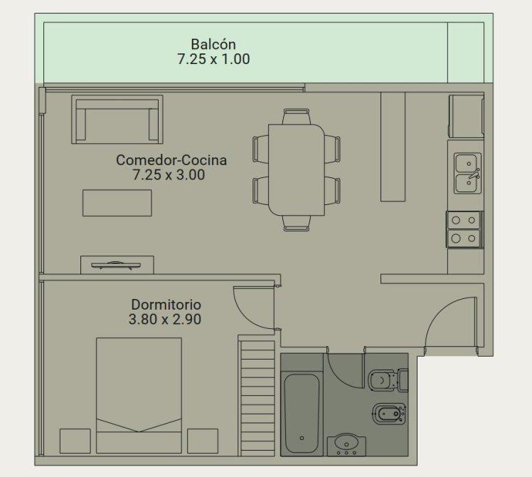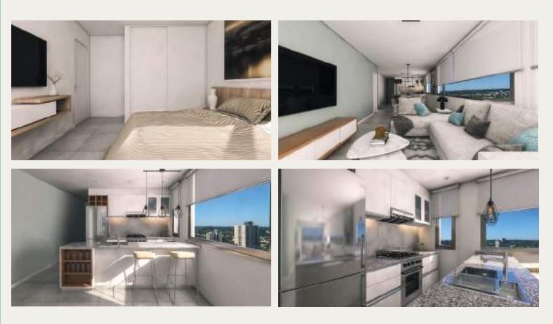 • 2 ambientes de 48 m2 totales, cocina comedor, dormitorio, baño y balcón. Con cochera.