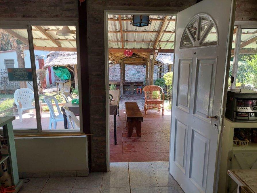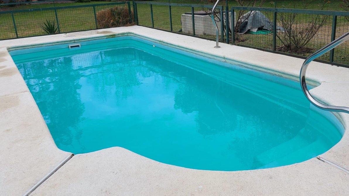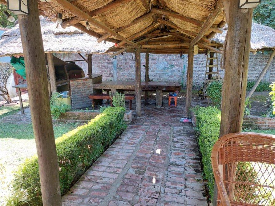 Piscina de natación, quincho con techo de paja que cuenta con parrilla y horno de barro, baño exterior para piscina.