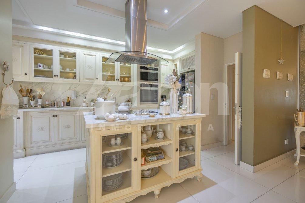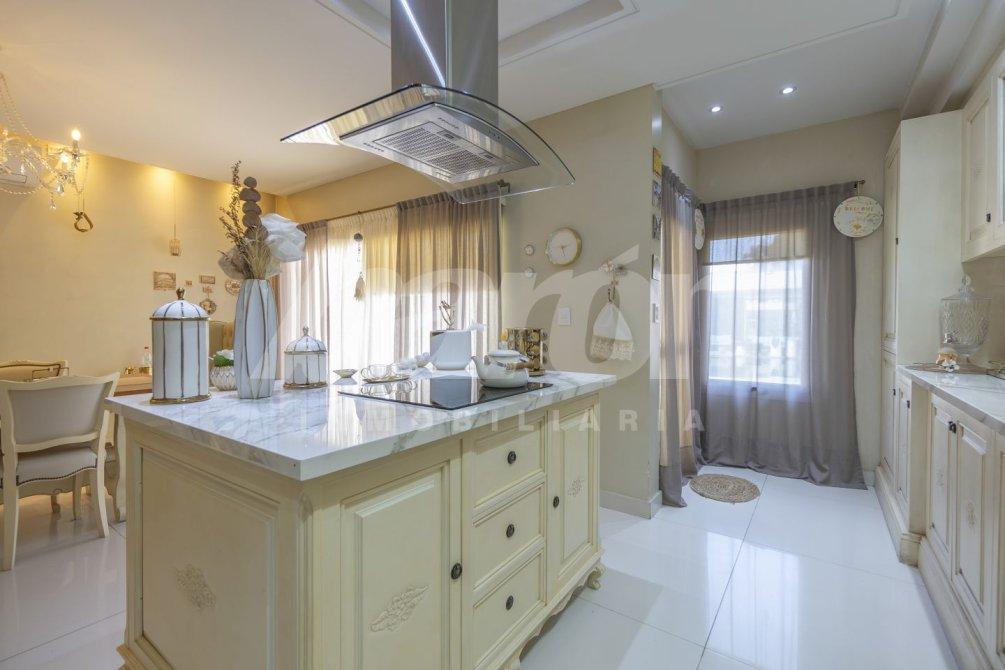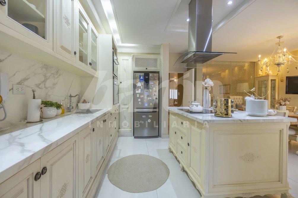 La cocina, de diseño moderno y completamente equipada, cuenta con muebles bajo y sobre mesada, isla central, horno empotrado, anafe y extractor.