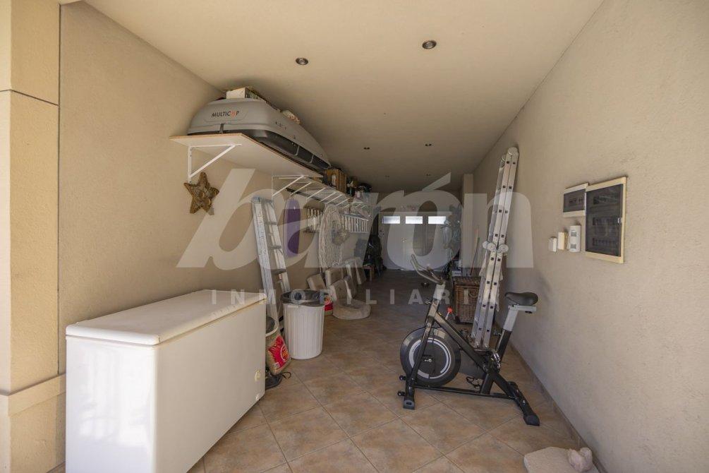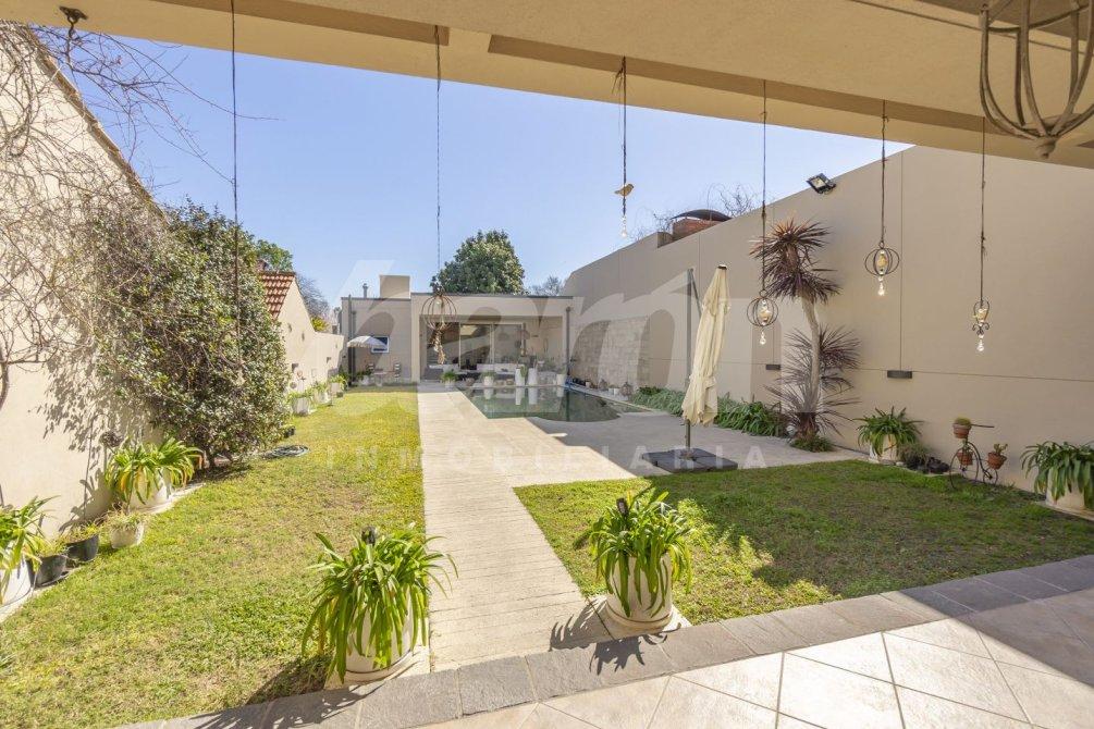 La propiedad cuenta con cochera con capacidad para tres vehículos, conectada a una galería semicubierta que recorre el lateral de la vivienda y se abre hacia un amplio parque libre con piscina.