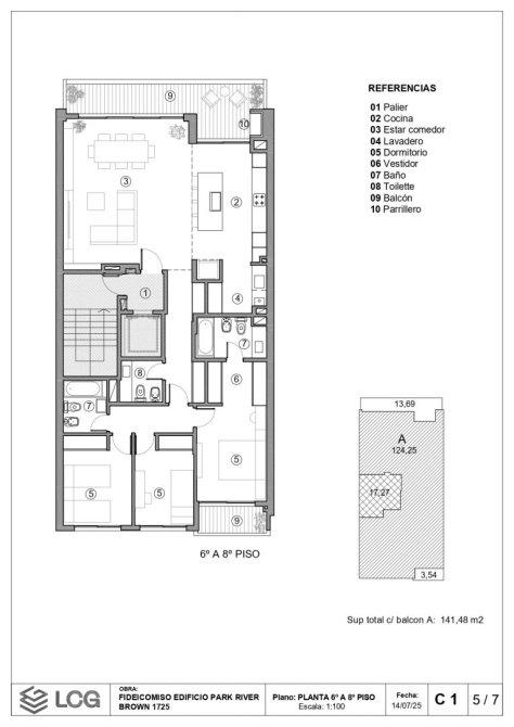 Unidad 06-01 piso sexto exclusivo  al frente con balcón corrido con parrillero, dos ba?os (uno en suite), toilette y cocina integrada al estar comedor. Isla con bacha, mesada con anafe, horno empotrado, lavadero independiente. Sector intimo dos dormitorios con placar, y principial en suite con vestidor y baño y balcón al contrafrente.