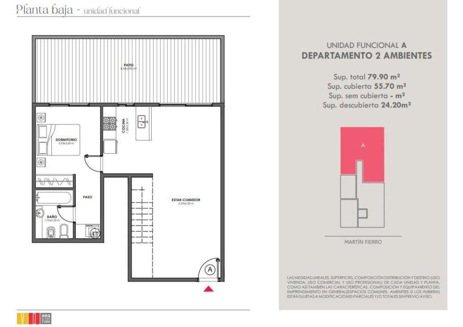 La unidad disponible se sitúa en planta baja y se destaca por ser la única con patio propio. Cuenta con 79,90 m² totales (55,70 m² cubiertos + 24,20 m² descubiertos).