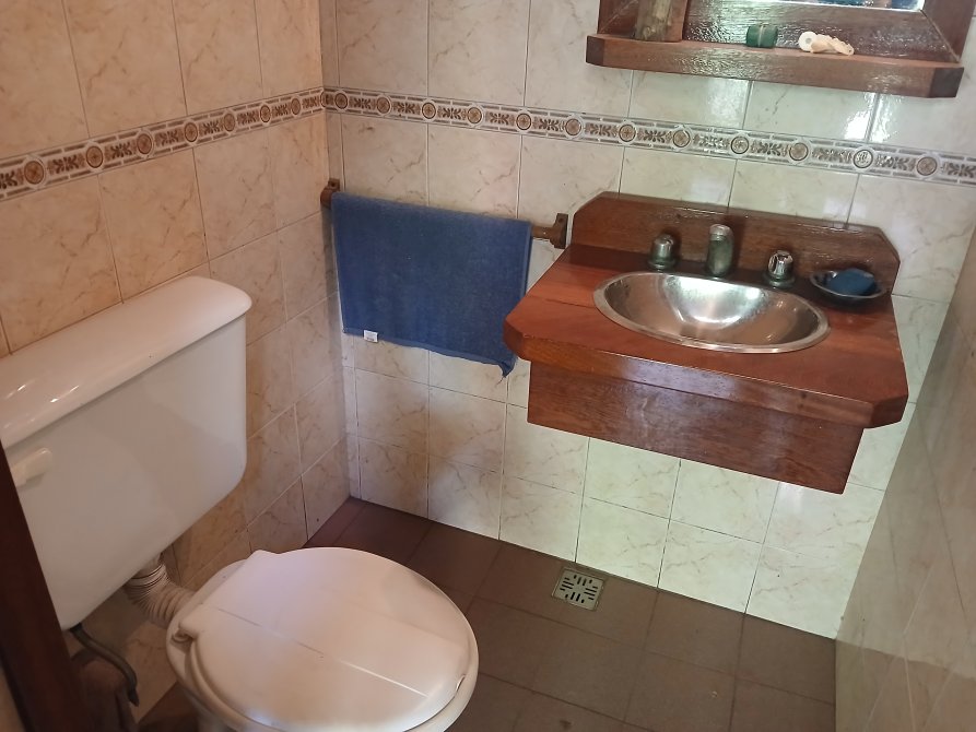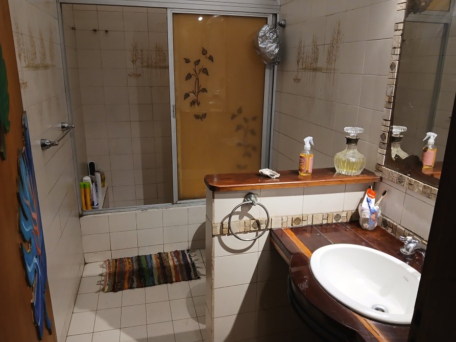 Baño completo de 3 x 1,50, con bañera y mampara de aluminio, pileta en antebaño.