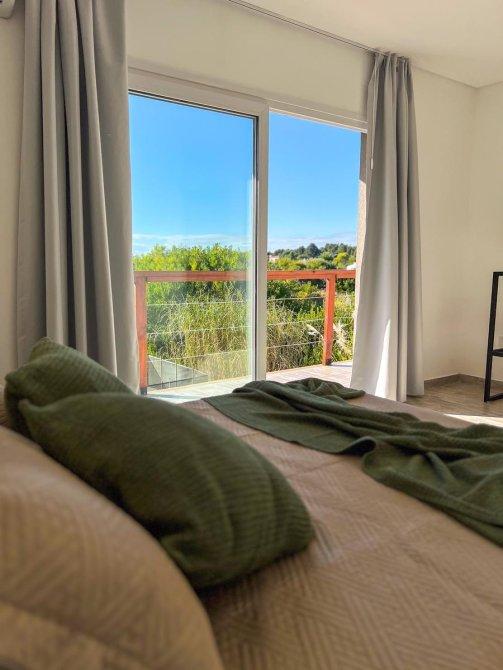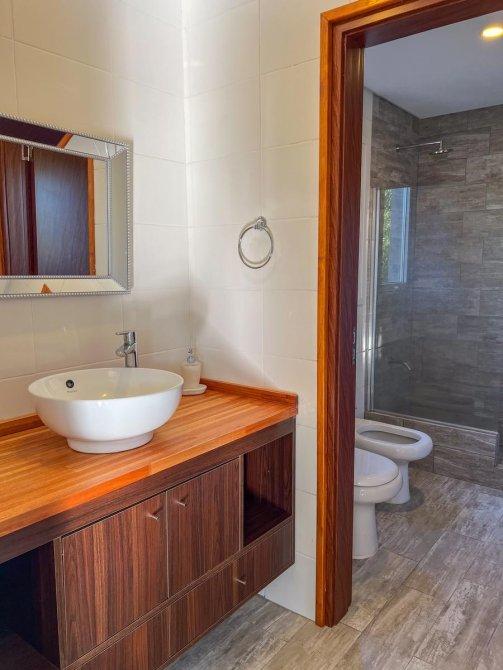 La propiedad cuenta con tres dormitorios, incluyendo un dormitorio principal en suite con vestidor y baño completo, proporcionando un refugio privado y cómodo. Las otras dos habitaciones son amplias y luminosas, con acceso a baños completos que aseguran comodidad para todos los miembros de la familia y las visitas. Además, hay un toilette adicional, añadiendo un extra de conveniencia.