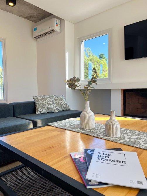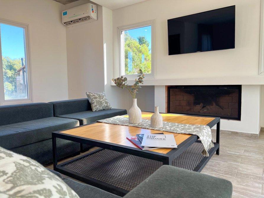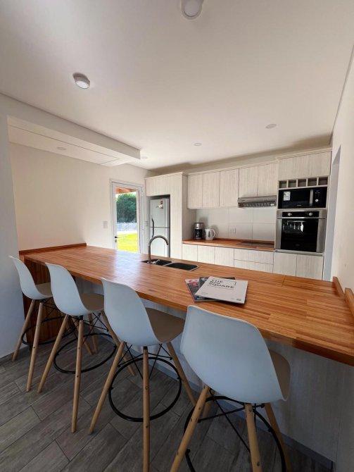 La cocina, integrada con el living, crea un ambiente abierto y acogedor, ideal para la vida cotidiana y el entretenimiento. Esta área conecta directamente con una galería que incluye una parrilla, perfecta para disfrutar de comidas al aire libre y reuniones sociales.