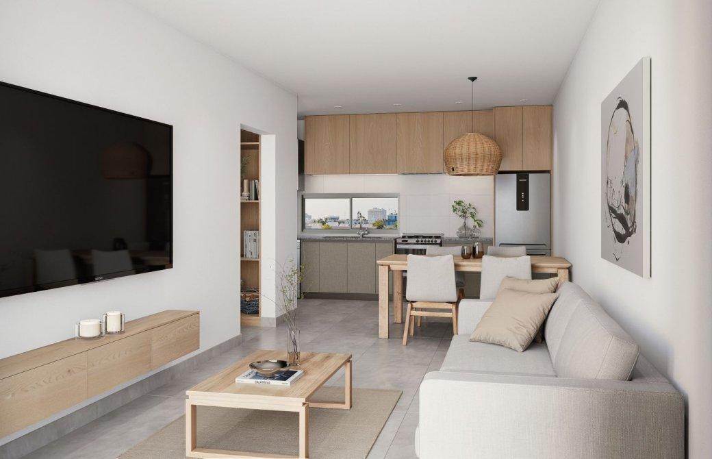 El ingreso se realiza a través de puertas  triple seguridad. El living comedor cuenta con pisos de porcelanato con salida al balcón . La cocina está integrada  equipada con muebles bajo y sobre mesada con mesada en granito, que aportan estilo y funcionalidad al espacio.