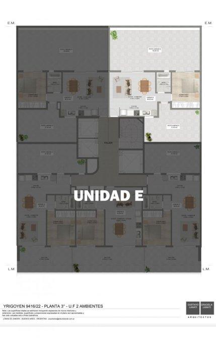 Unidad dos ambientes ubicada en el piso 3ºE  frente de 46.50m2 + patio al contra frente  y patio privado interno en el edificio Barón Avenue. Se encuentra sobre Avenida Hipólito Yrigoyen 9416, en un punto estratégico que asegura la mejor conectividad y acceso a todo lo que el entorno tiene para ofrecer.