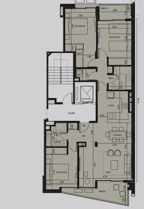 Departamento compuesto por Living-Comedor, cocina semi-integrada. 3 Dormitorios. 2 Baños completos. 2 Balcones. Lavadero