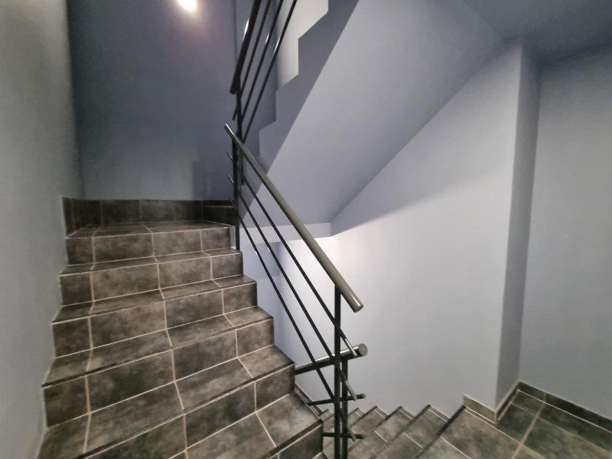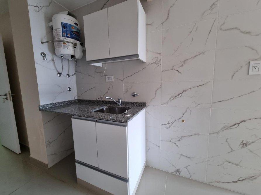 Ingreso por cocina comedor, cuenta con calefón, bajo mesada y alacena de melamina blanco, mesada gris mara y bacha de acero inoxidable y salida al balcón hacia la calle. Hacia el contrafrente se accede al baño con bañera, vanitory y sanitarios de porcelana continuado el vestidor y por ultimo al dormitorio con ventana hacia el patio interno. Los pisos son de porcelanato pulido, los revestimientos de baño y cocina hasta el techo en cerámicos esmaltados.