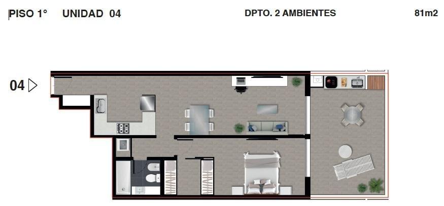 Departamento de 1 dormitorio ubicado en la torre 1, pisos del 2 al 8 unidad 4, contra frente, orientación este, cuenta con cocina integrada, baño completo y balcón