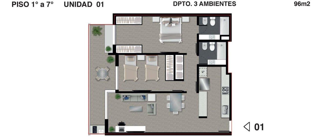 Departamento de 2 dormitorios, ubicado en la torre 1, pisos 1 al 7 unidad 1, frente, orientación oeste, cuenta con cocina integrada, 1 baño completo y balcón