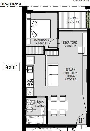 Ingreso por un amplio estar comedor, cocina semi integradacon y Baño completo. Espacio para Escritorio y salida al Balcón. Luego cuenta con un dormitorio. 45 mt totales.