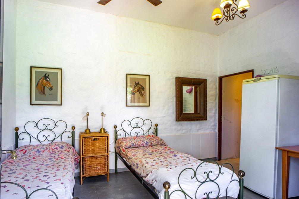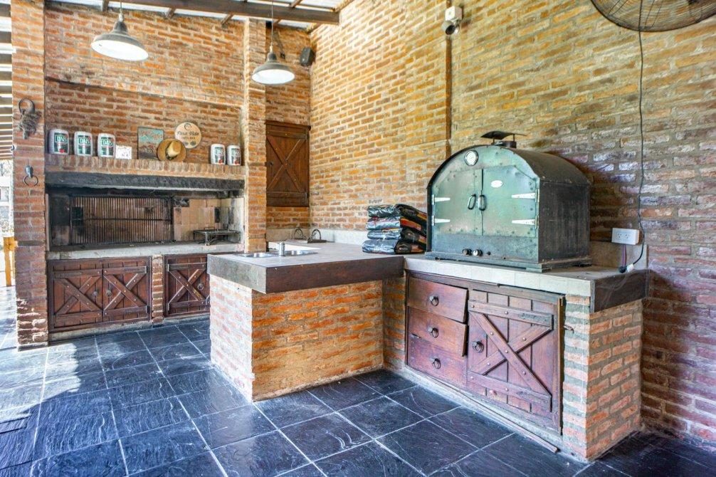En la medianera oeste del terreno se ubica la cochera de grandes dimensiones y capacidad para guardar 3 vehículos bajo techo y a su vez sirve como quincho galeria ya que cuenta con horno a leña, parrillero y mesada con bacha. Siguiendo por la medianera se encuentra el cuarto de lavado y planchado con mesada, bacha e instalaciones para lavarropas y secarropas, luego continua un departamento o dependencia (donde se ven 2 camas de 1 plaza, una heladera y un escritorio) y el baño completo. Por último, un espacio cerrado en sus laterales y descubierto para colgar la ropa.