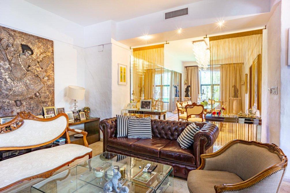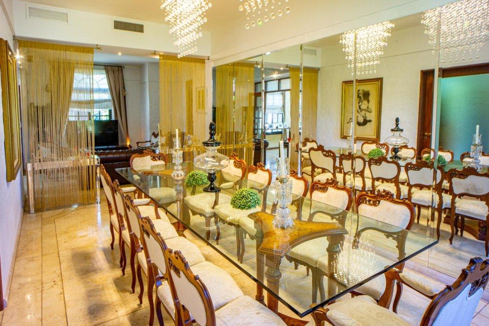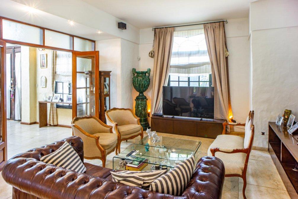 Cuenta con un retiro de 5,5 metros de la línea de edificación para ingreso de vehículos. El acceso principal se ubica en el centro de la fachada y cuenta con doble puerta de madera con herrajes de hierro donde se encuentra un gran distribuidor. Hacia la izquierda se encuentra el living separado de una gran abertura de madera con vidrios repartidos, un hogar a gas natural, ventilación natural hacia la calle a través de una gran ventana de hierro con abertura de medio punto, y acceso a un gran comedor donde cuenta con una pared de espejos y luz natural a través de un ventanal hacia el jardín, ambos ambientes tienen pisos de mármol.