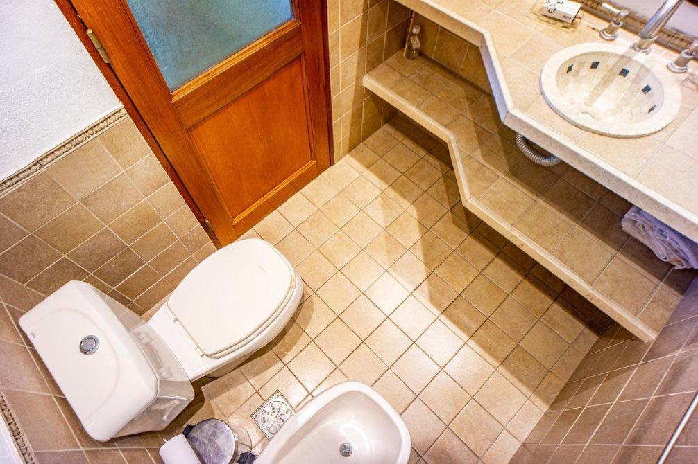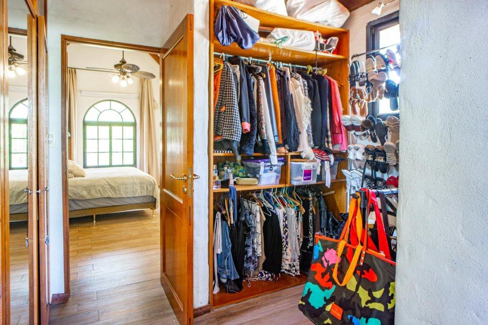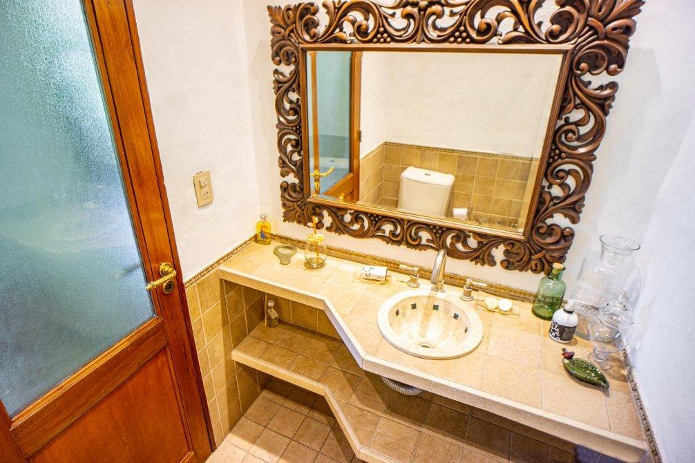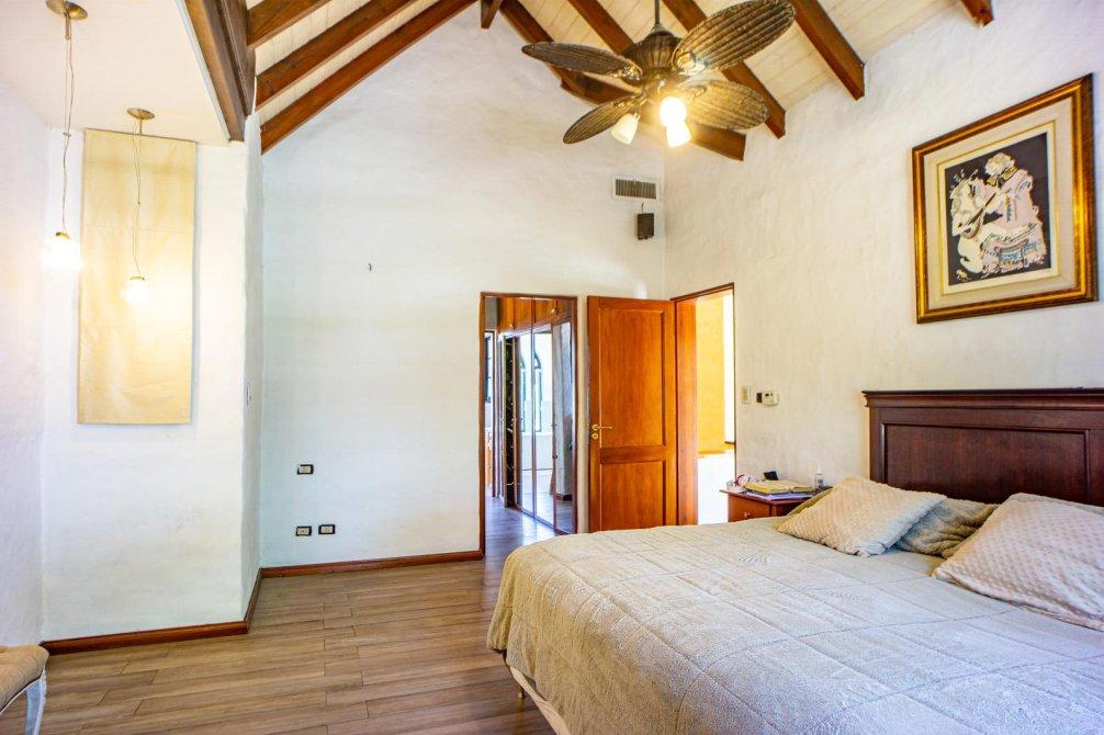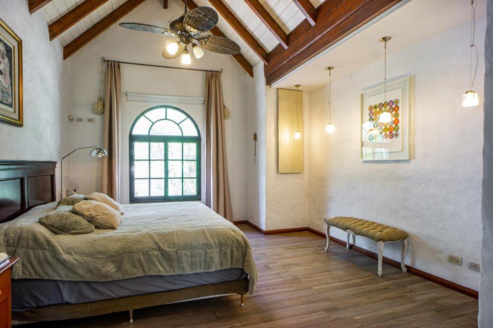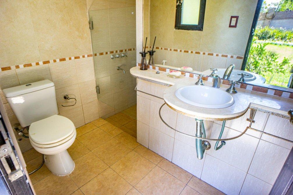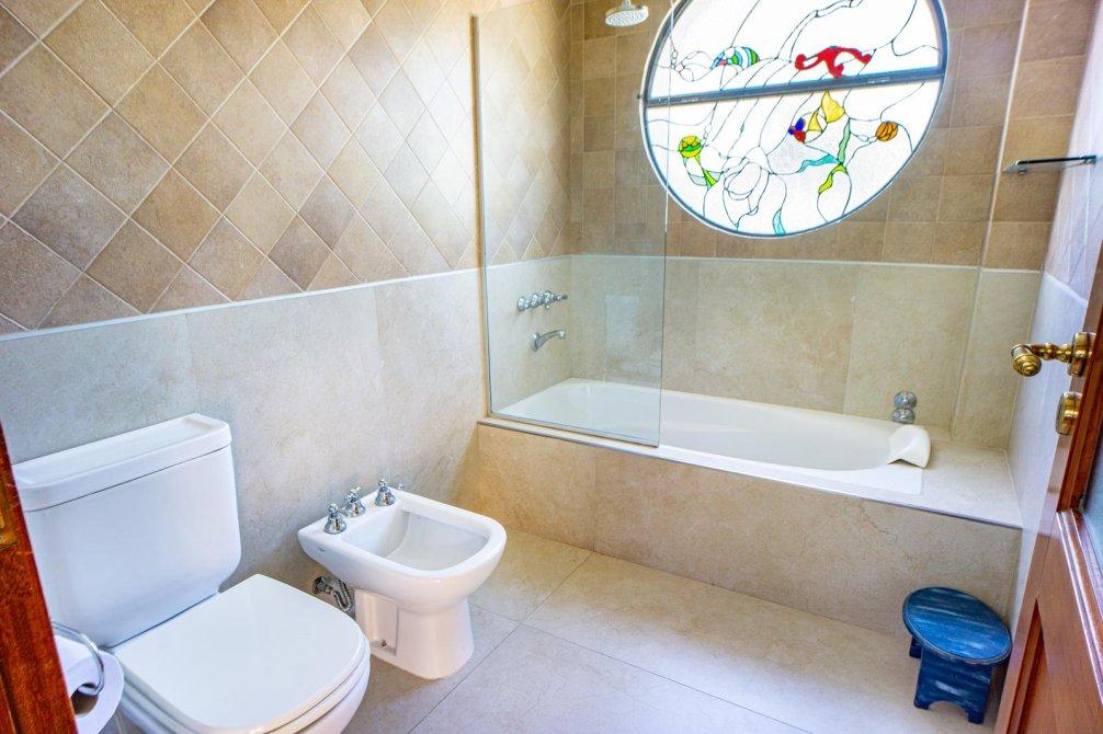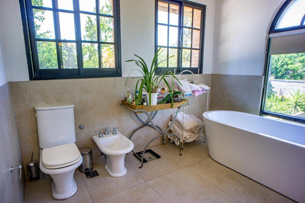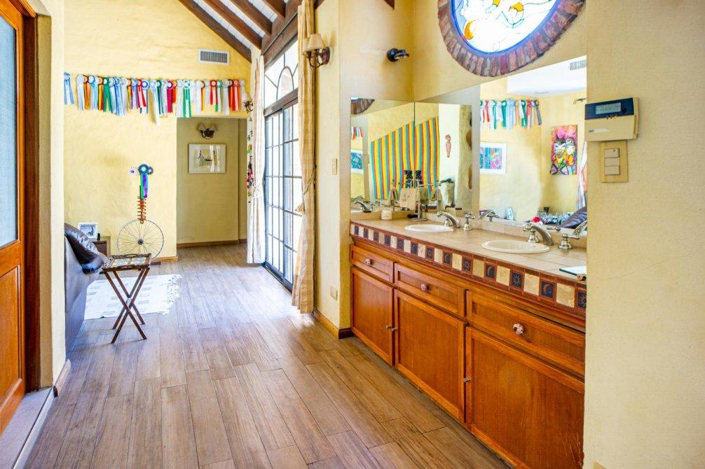 En planta alta se ubica en su medianera este un dormitorio de grandes dimensiones con vestidor y acceso al baño; este cuenta con vanitory con mueble bajo mesada, sanitarios completos, toallero calefaccionado una bañera de cerámica con vista a la laguna del jardín y ducha.
