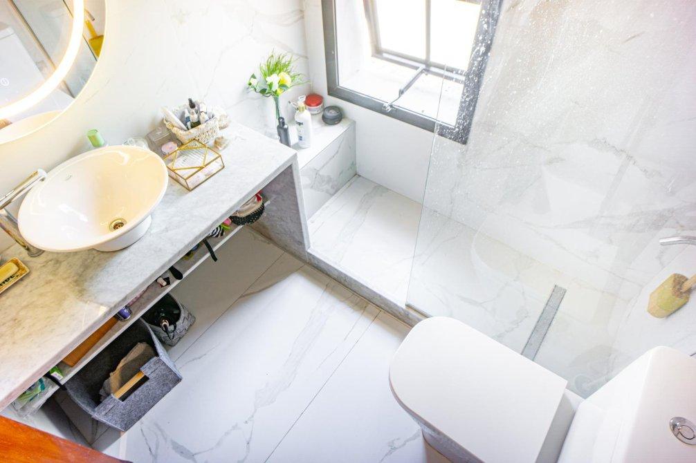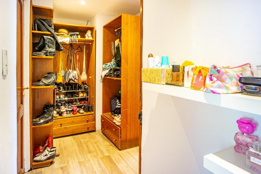 Hacia el centro se encuentra 2 amplios ventanales con acceso a la terraza balcón hacia el frente de la casa, entre medio el vanitory con doble bacha, en contraposición un baño completo con griferías, sanitarios y bañera de primera calidad. A su costado un espacio social que podría cerrarse para conforman el cuarto dormitorio (dentro de la propiedad) y por último el acceso a dos dormitorios que se comunican por un vestidor en común (puede anularse para uno u otro de los dormitorios) y el baño totalmente revestido en porcelanato pulido blanco con vetas grises, un vanitory de mármol grande con bacha de apoyar.