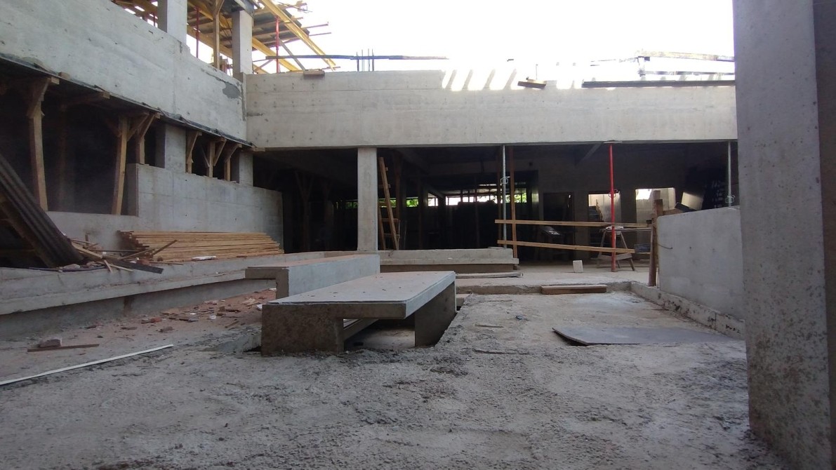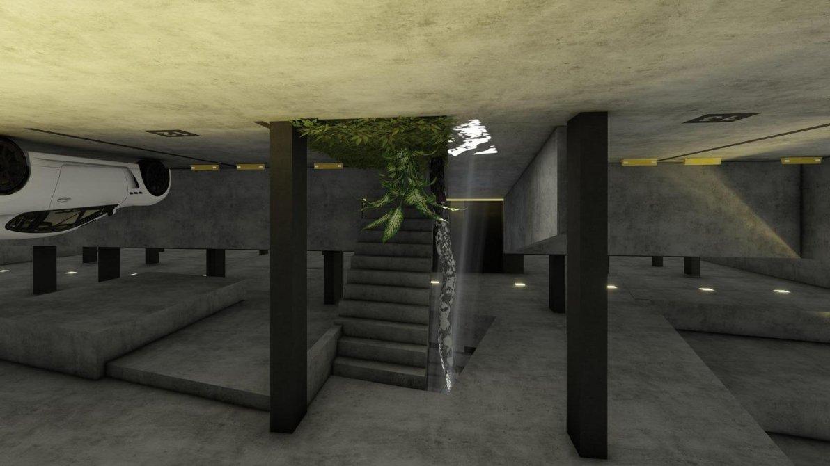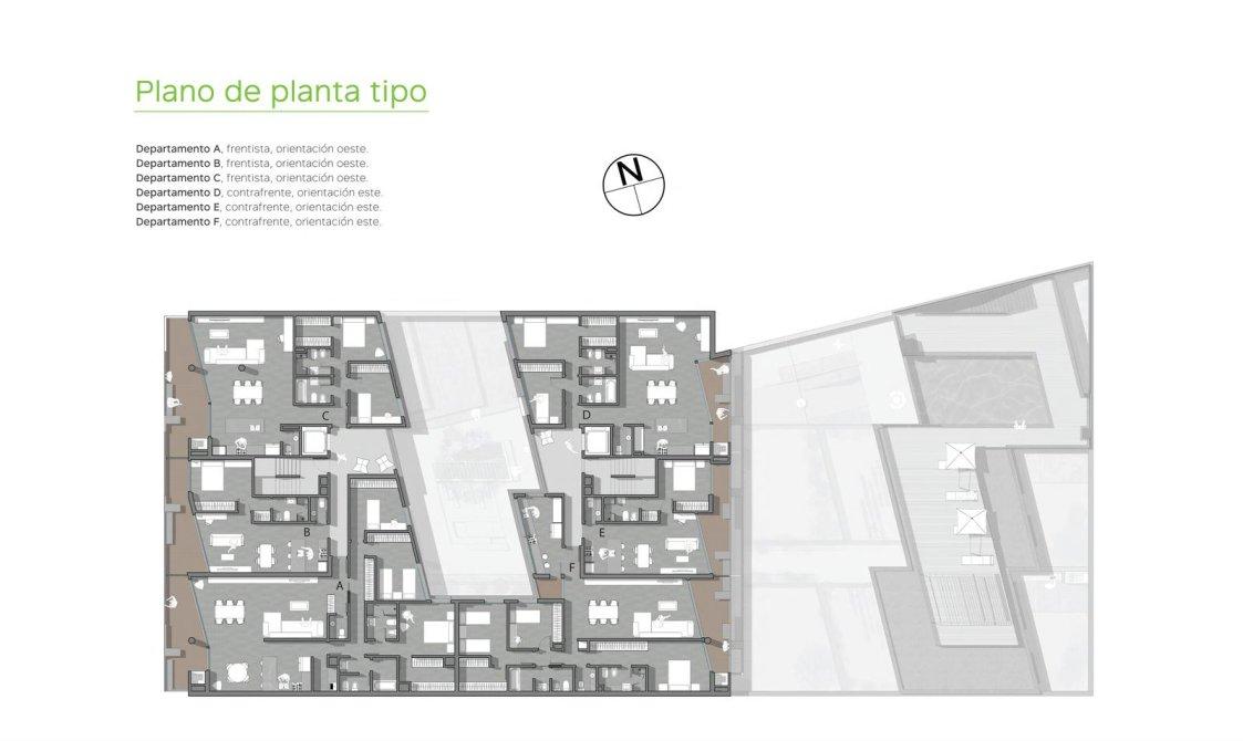 Patio interno con carácter de hall al aire libre. Su uso en planta baja es de distribuidor principal peatonal a todo el edificio, es un espacio a cielo abierto desde donde dirigirse a todos los sectores: recreativos, deportivos y de viviendas. Forestado con jardines verticales, canteros y un árbol que emerge desde el subsuelo cuyo objetivo es oxigenar, silenciar, y dar sombra a este lugar…