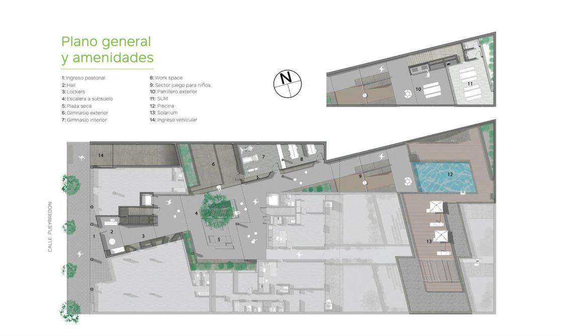 El edificio cuenta con grandes superficies de espacios abiertos arbolados, un nivel subterráneo de cocheras, locales comerciales en planta baja y cuatro pisos altos de departamentos de uno, dos y tres dormitorios. Cada una de las unidades cuenta con amplios balcones terrazas. El nivel superior cuenta con terrazas exclusivas en la azotea.