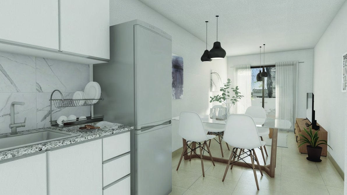- Muebles de cocina completos: bajo mesada y alacena en MDF enchapadas en melanina, mesada