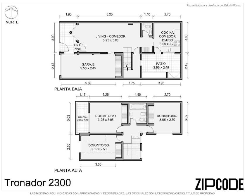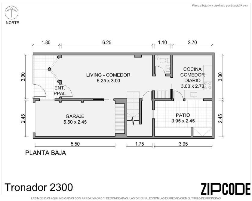 Planta baja: living-comedor con acceso al garage, toilette, escritorio bajo escalera, cocina y patio con parrilla y. lavadero semicubierto.