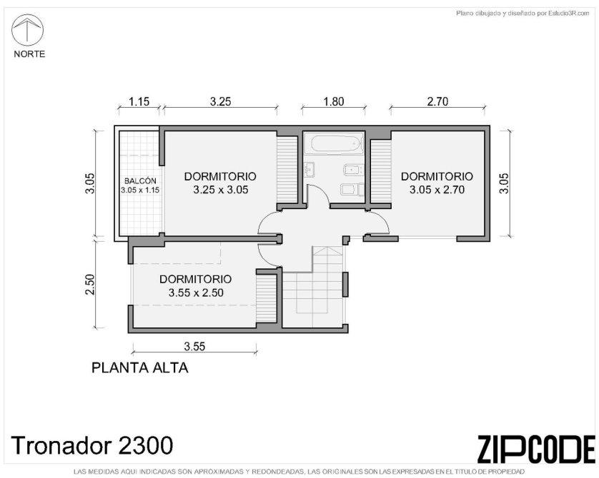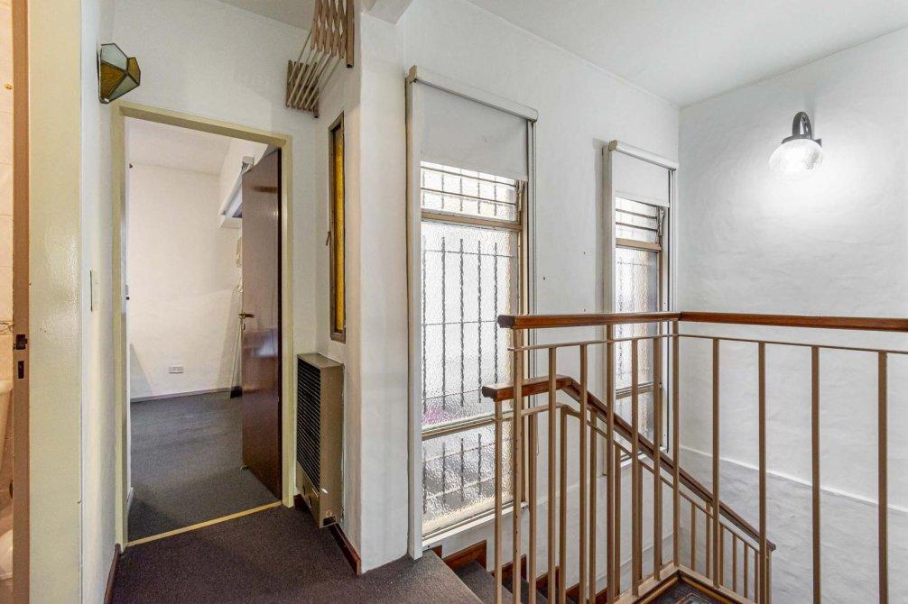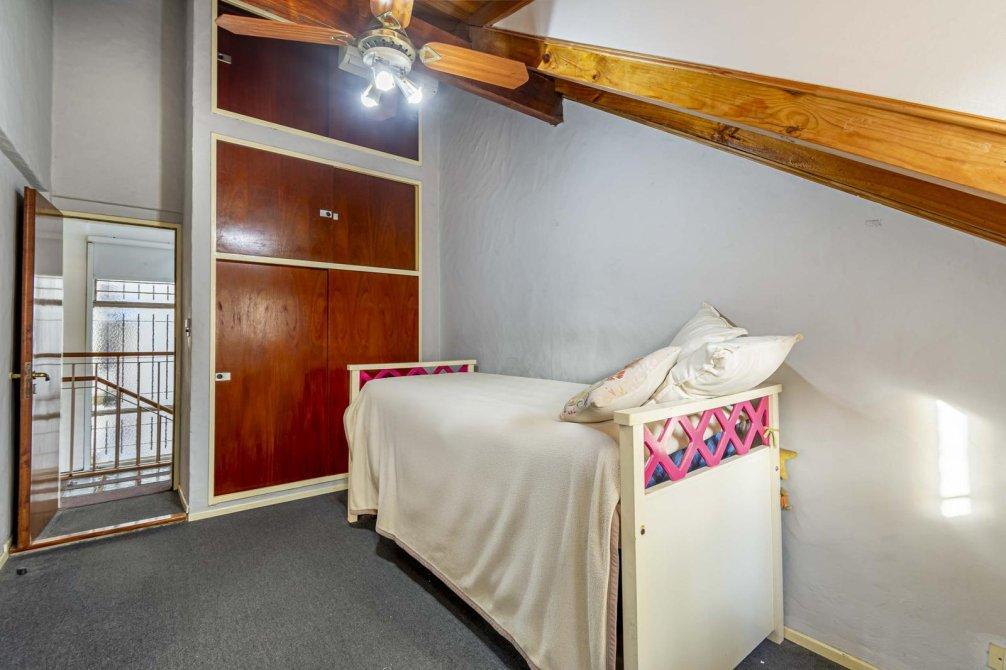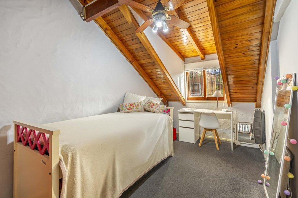 Planta alta: tres dormitorios con buenos placares y bauleras (uno con balconcito, otro con ventana abuhardillada), y un baño completo.