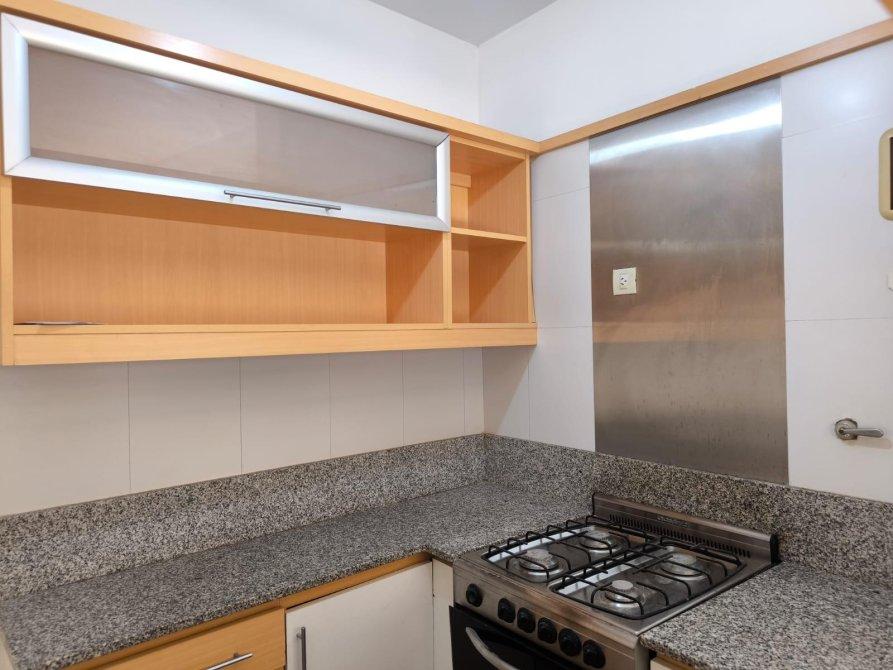 * Cocina semiintegrada mediante barra desayunadora, con muebles bajo mesada y alacena en melamina clara, mesada de granito, doble bacha y cocina a gas. Su diseño funcional integra la cocina al área social manteniendo independencia visual.
