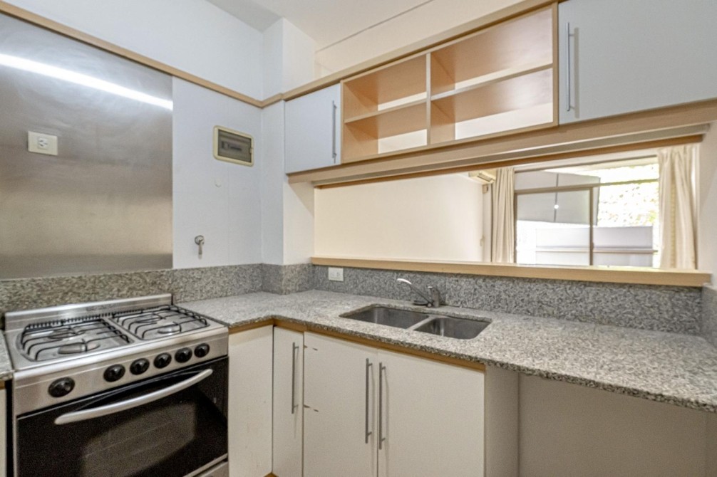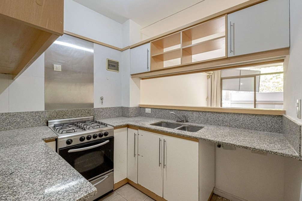 * Cocina semiintegrada mediante barra desayunadora, con muebles bajo mesada y alacena en melamina clara, mesada de granito, doble bacha y cocina a gas. Su diseño funcional integra la cocina al área social manteniendo independencia visual.