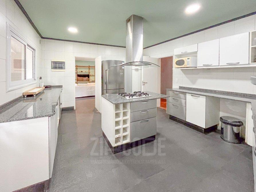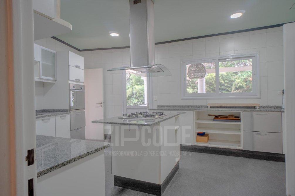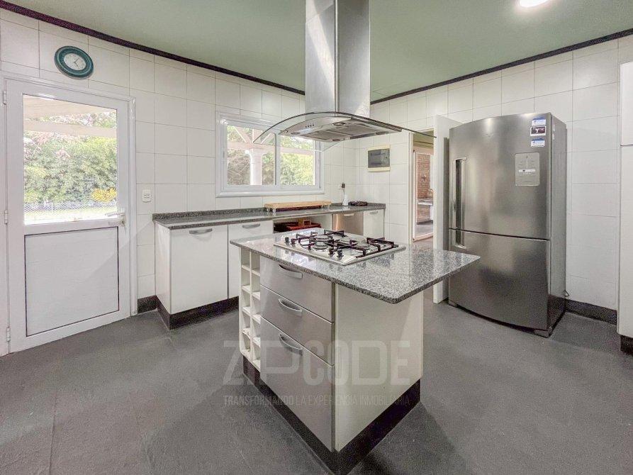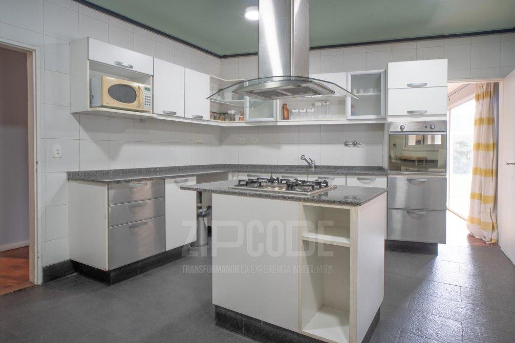 Cocina con isla central, con alacenas y bajomesadas (gran espacio de guardado), campana de acero inoxidable, cocina a gas, y horno a gas y eléctrico. -