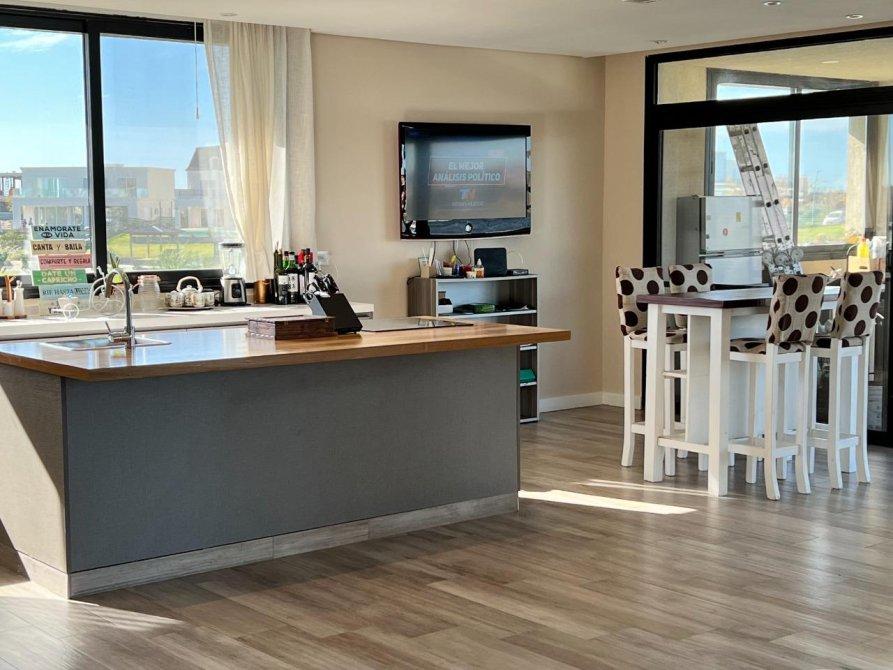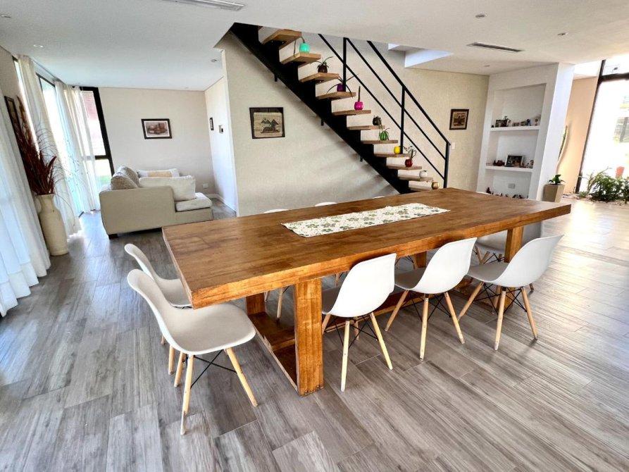 Desde la cocina comedor ( family) tenemos acceso a la galeria, con parrilla, espacio de reuniones familiares y de amigos, màs espacio de fogonero, jardìn, pileta con borde infinito, solarium, muelle