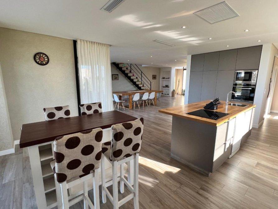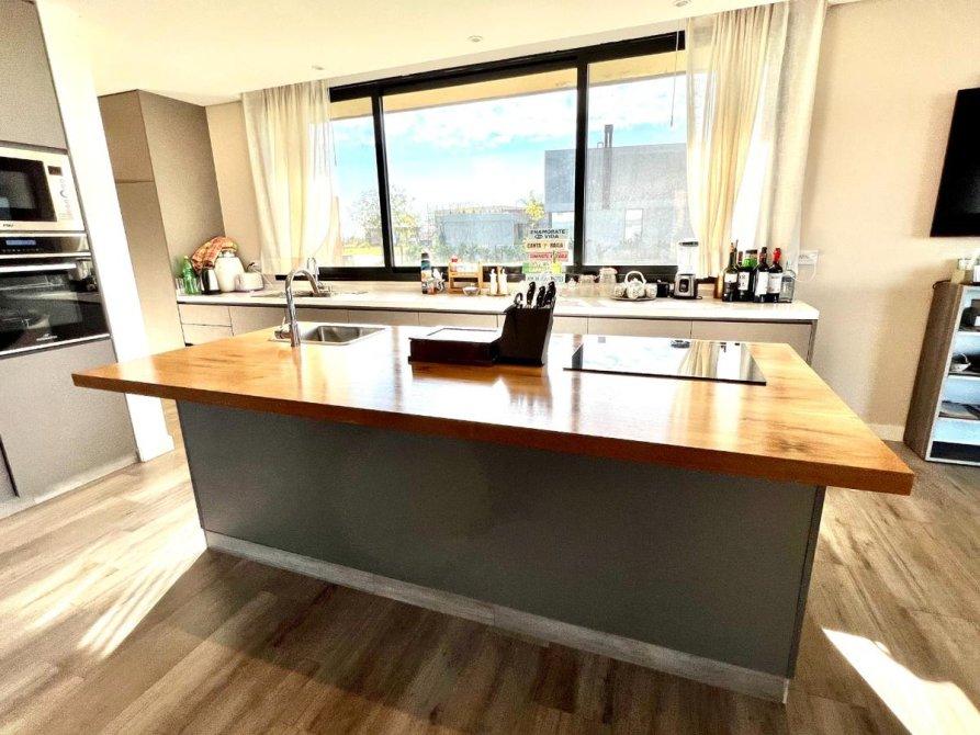 Planta Baja: Nos recibeamplio living-comedor integrado a la cocina con isla màs la comodidad de un desayunador de uso diario. Espacio de lavavajilla, bacha doble, espacio para una heladera doble, anafè elèctrico vitroceràmico, muebles de melamina de primera calidad , horno elèctrico digital y espacio de microondas. Lavadero y despensa.
