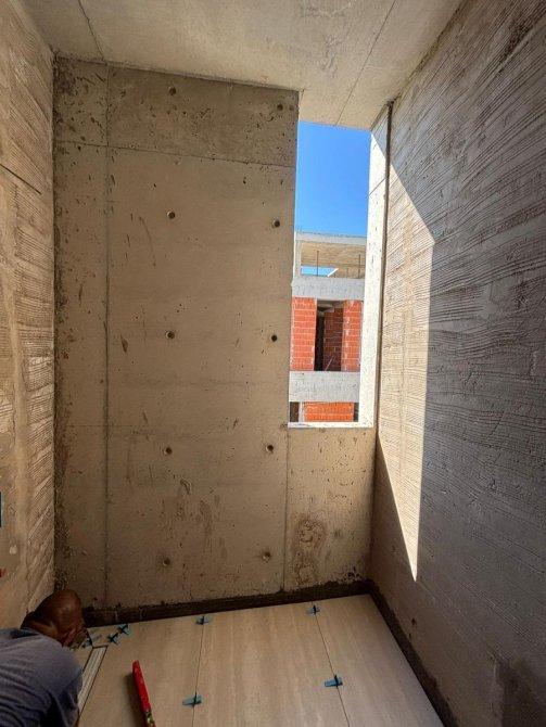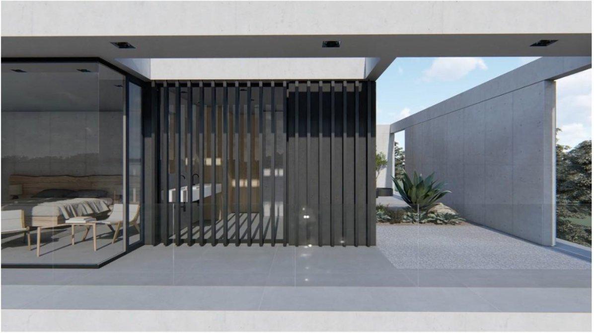 Hormigón visto en tabiques exteriores y cielorrasos. Revestimientos interiores y muebles de madera enchapada lustrada. Puertas de madera a medida.