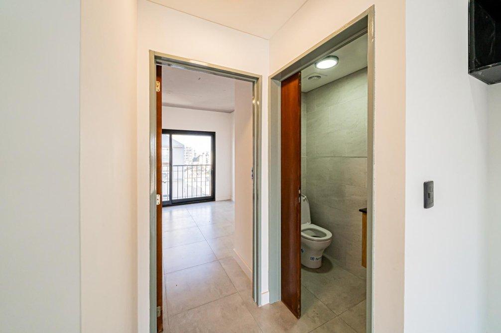 Departamento a estrenar ubicado en una de las zonas más atractivas de Caballito. Living comedor con cocina integrada, toilette, balcón terraza de 18 m² que recorre todo el frente del departamento, dormitorio en suite con balcón francés al contrafrente. Ventilación cruzada natural y luz natural todo el día.