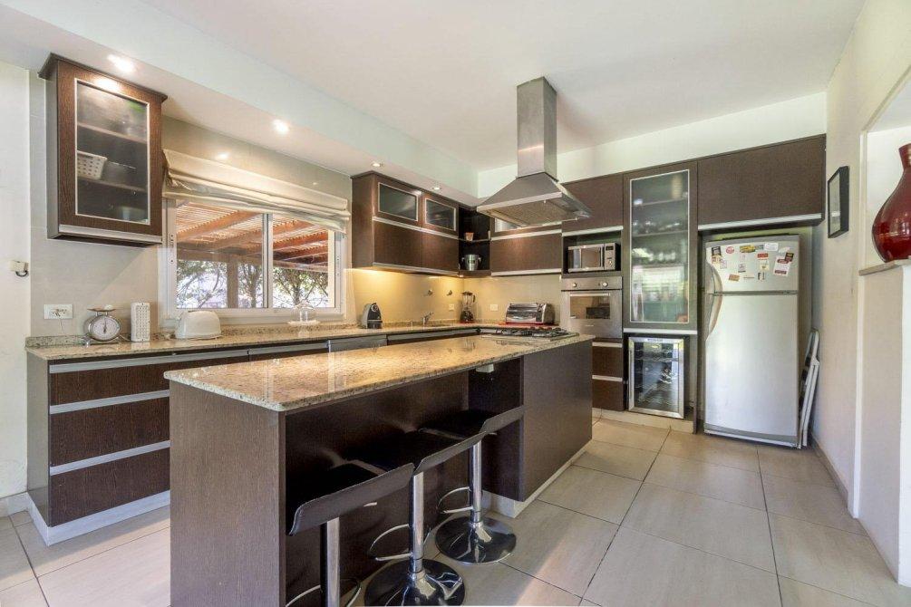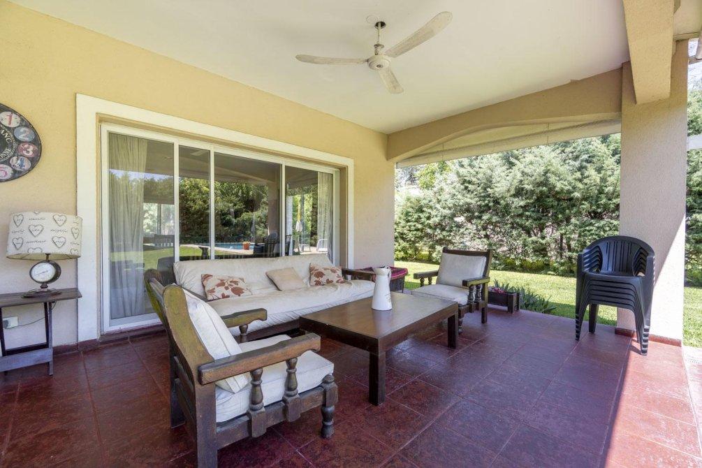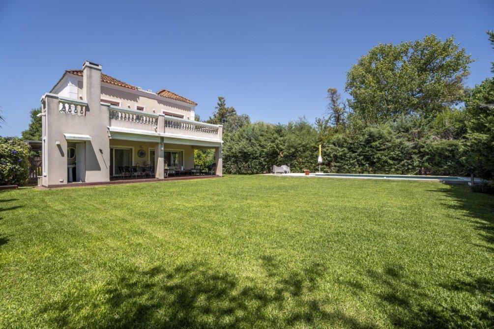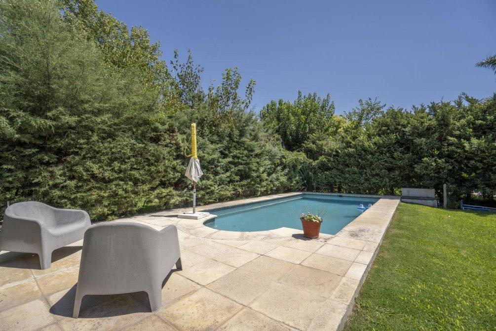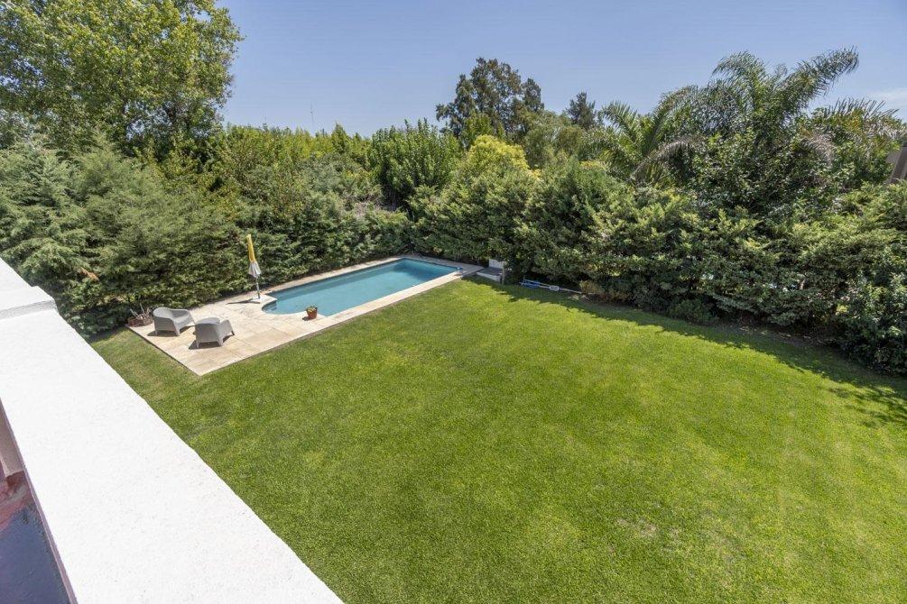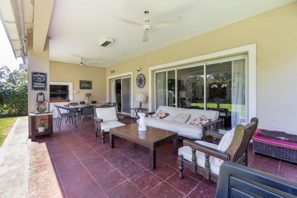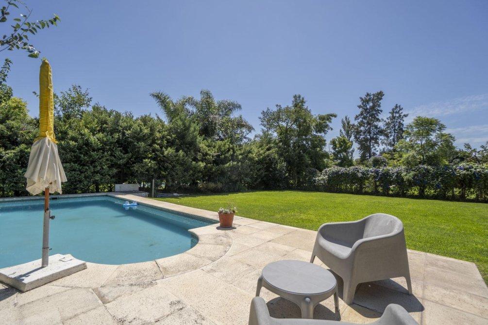 El jardín es un espacio destacado de la propiedad, que incluye una amplia galería de 54 m², parrilla, baño y piscina.