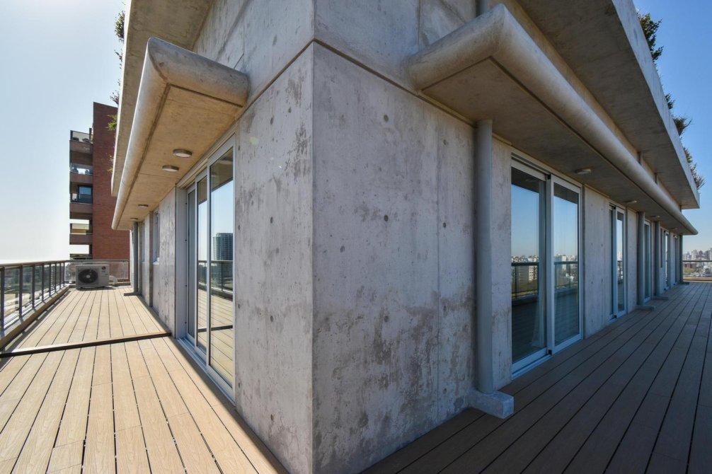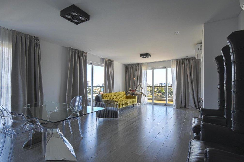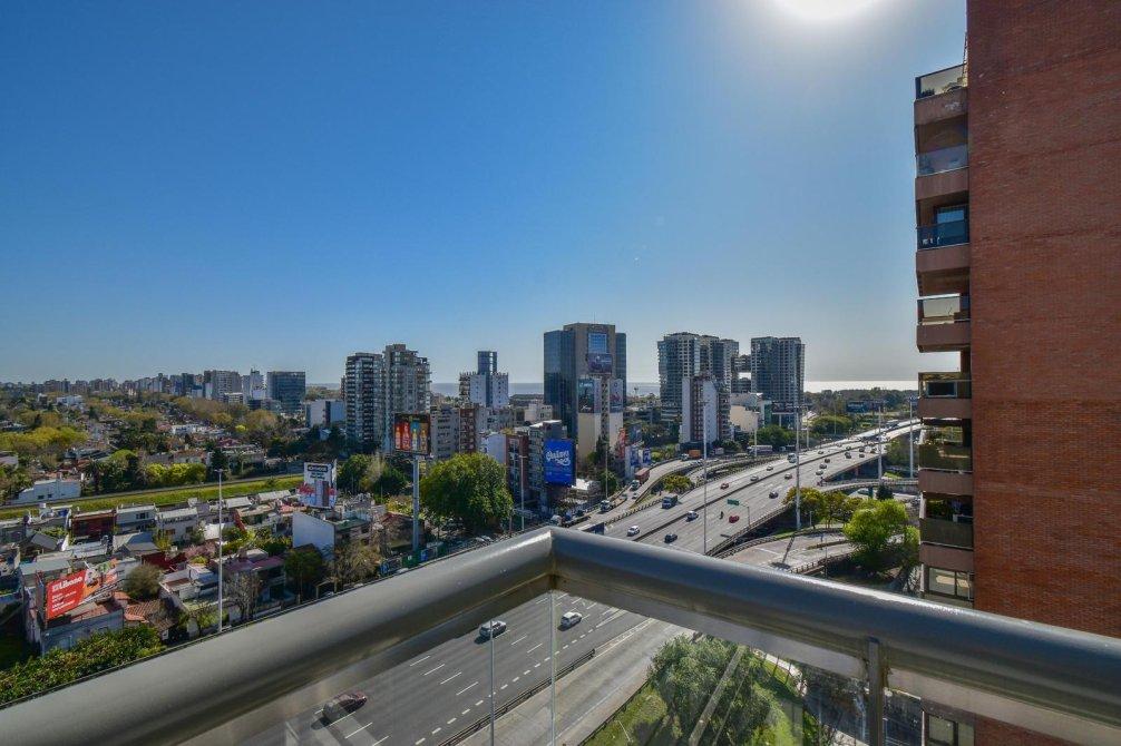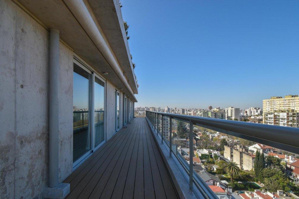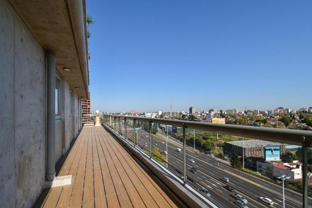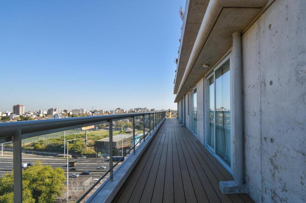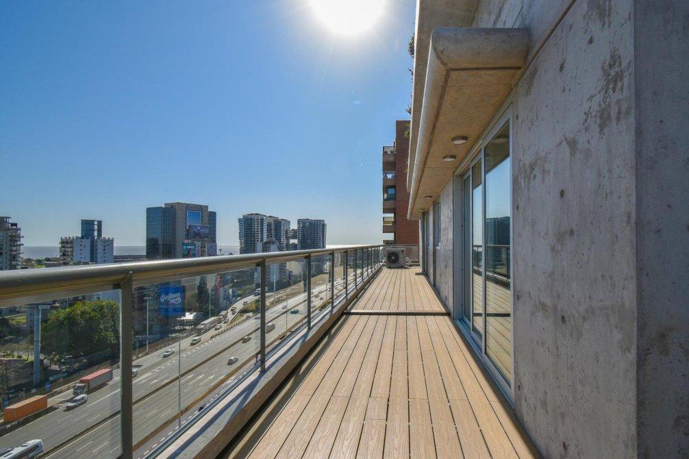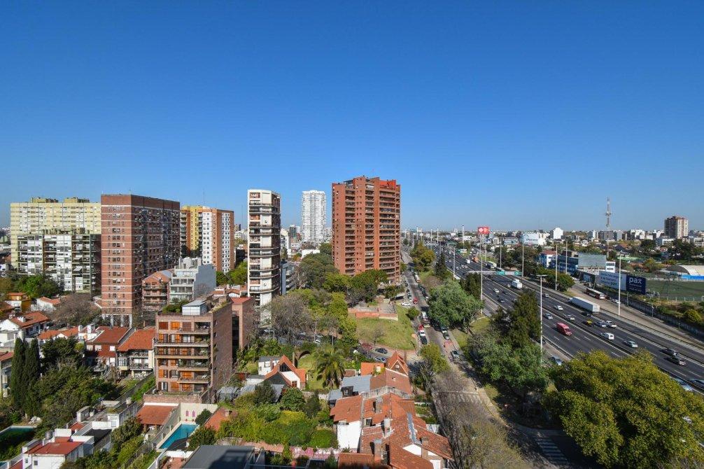 El corazón de la propiedad es un espectacular living comedor con ventanales DVH (doble vidriado hermético) de piso a techo que integran de forma perfecta interior y exterior, conectando con un balcón perimetral con deck de madera, que rodea toda la planta y ofrece postales soñadas al río, la ciudad y la Av. General Paz.