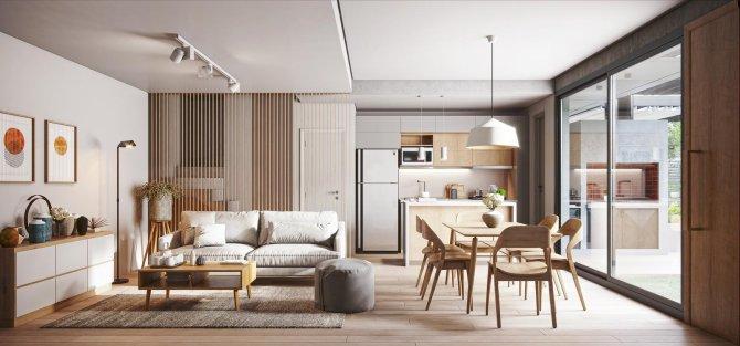 Al ingresar nos encontramos con un amplio estar comedor de 5,80m x 4,10m, una cocina semi integrada de 2,90m x 1,80m y una separación generada por una isla amplia isla, a su vez en tenemos un baño estilo Toilette para el sector social.