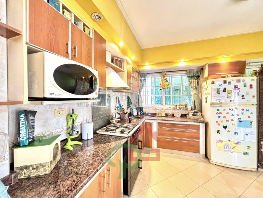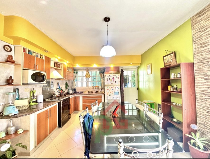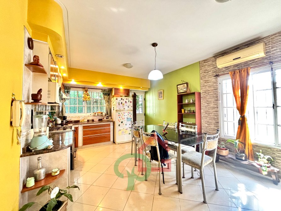 •    Cocina comedor grande, con muebles bajo y sobre mesada, varias ventanas que aportan luz y ventilación, y salida al fondo.
