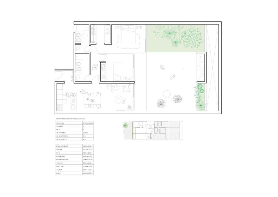 Unidad 01-01:  Departamento de dos dormitorios, uno en suite, con balcon y patio, cuenta con living comedor luminoso, cocina semiseparada, baño completo con bañera, balcon con orientacion norte  con terraza exclusiva con parrillero.