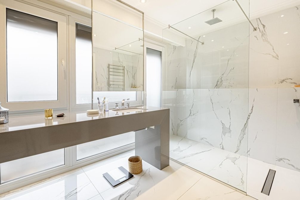 Baño principal con con bañera, mamparas de vidrio y una ventana que aporta luz natural y circulacion de aire.