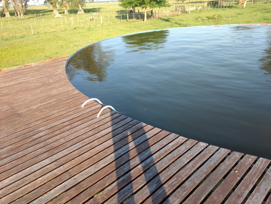 Tanque australiano de unos 50 m2, con Deck de madera y piso de cemento (para uso como pileta de natación).