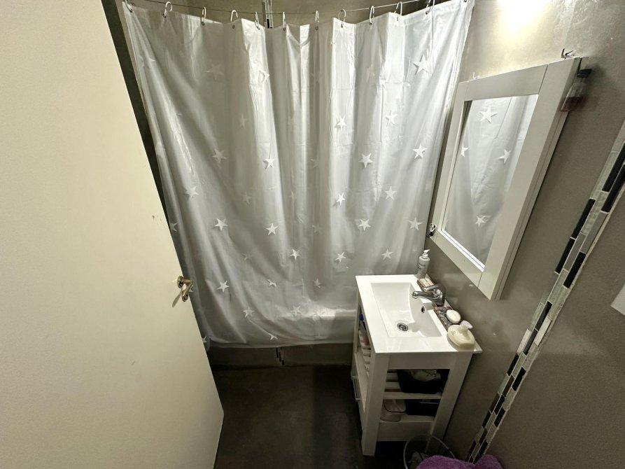 Baño completo con piso y revestimiento de cemento alisado.