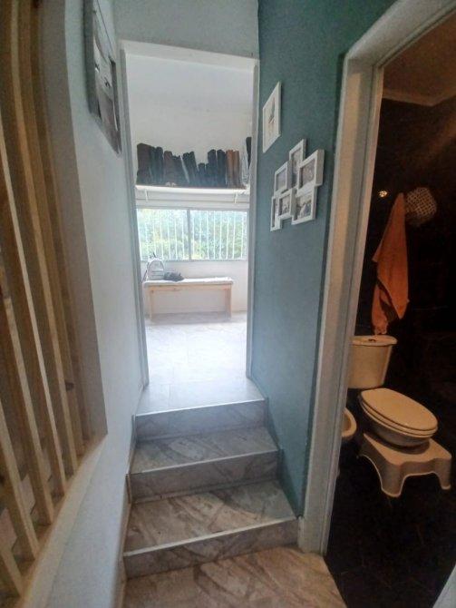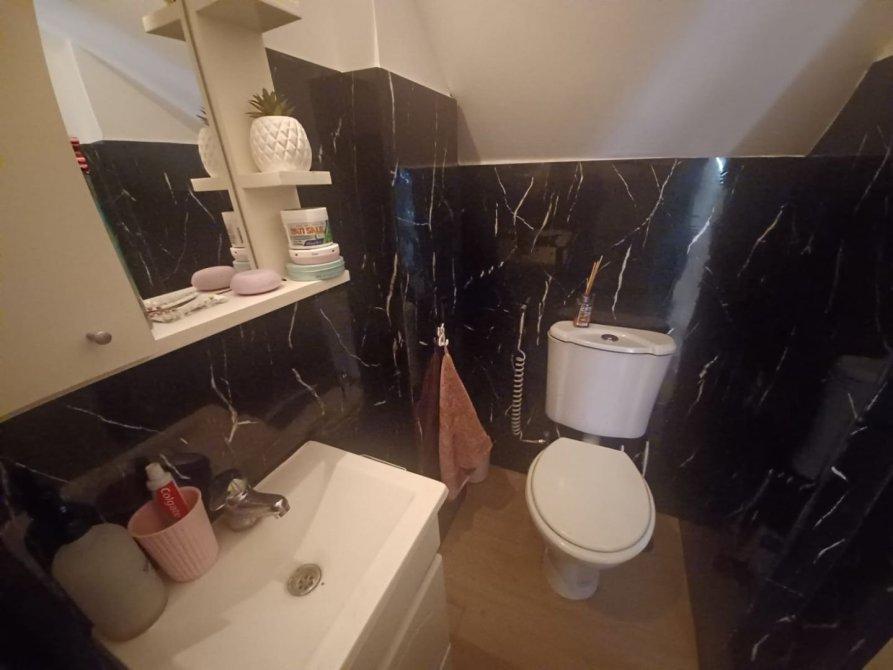 Baño completo revestido en placa símil mármol negra con ducha escocesa en planta alta.
