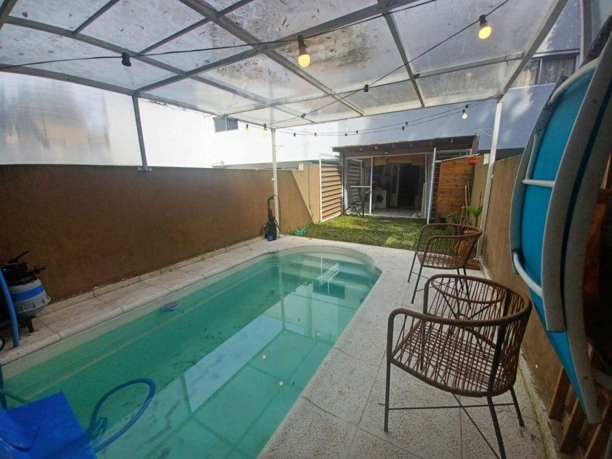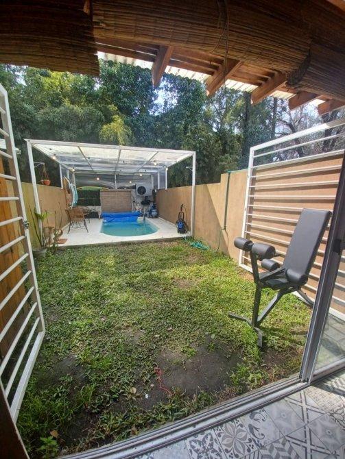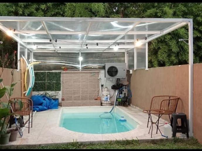 Patio con pasto aprox 4 x 4 mts y pileta techada con estructura de hierro y policarbonato transparente de aprox 4 x 5.5 mts con baldosas atermicas, climatizador Electrico funcionando que llega hasta los 40ºC y bomba portátil.