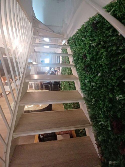 Detalles de calidad modernos como ser pared bajo escalera revestida con jardín vertical artificial interior.