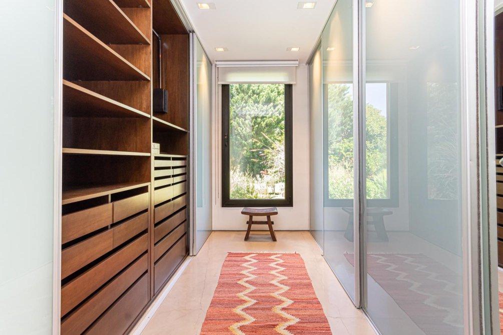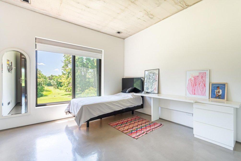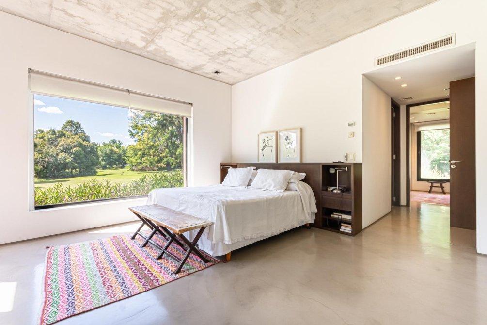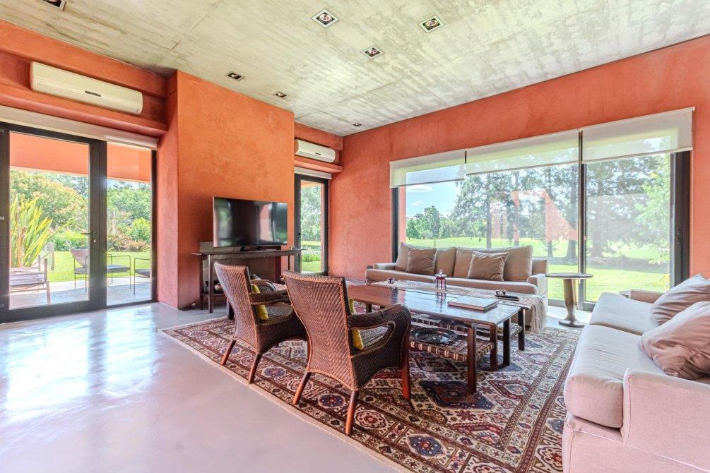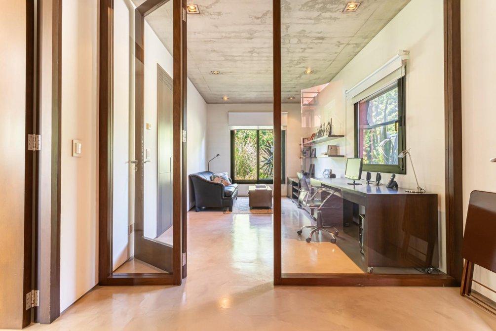 También en la planta baja, se encuentra un área tipo departamento que incluye: una master suite con un gran ventanal con cortinas automáticas y vista al campo de golf; el baño, revestido en mármol de Carrara, con ducha y bañera; un importante vestidor, un escritorio con kitchenette y sala de TV, conformando un espacio amplio y muy cómodo en la casa para disfrutarlo y/ó poder trabajar cómodamente en Planta Baja.