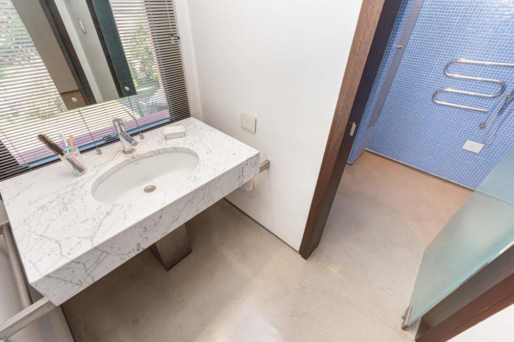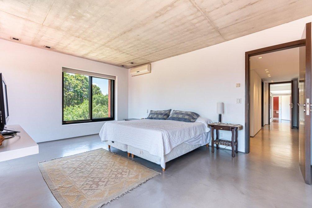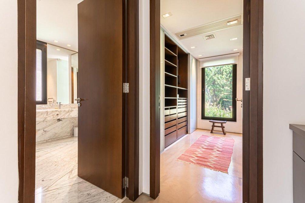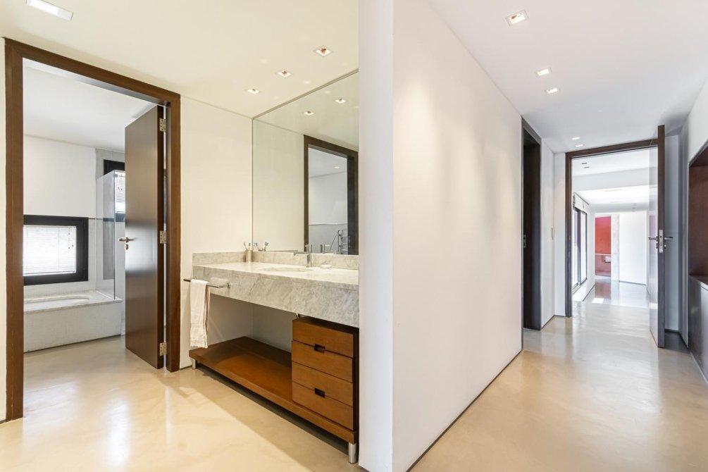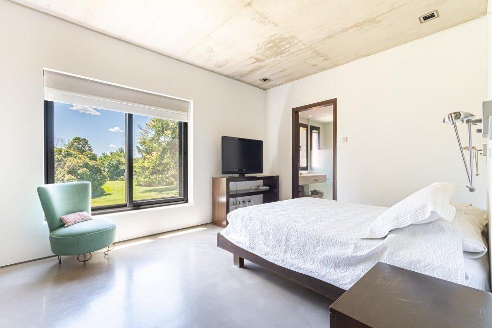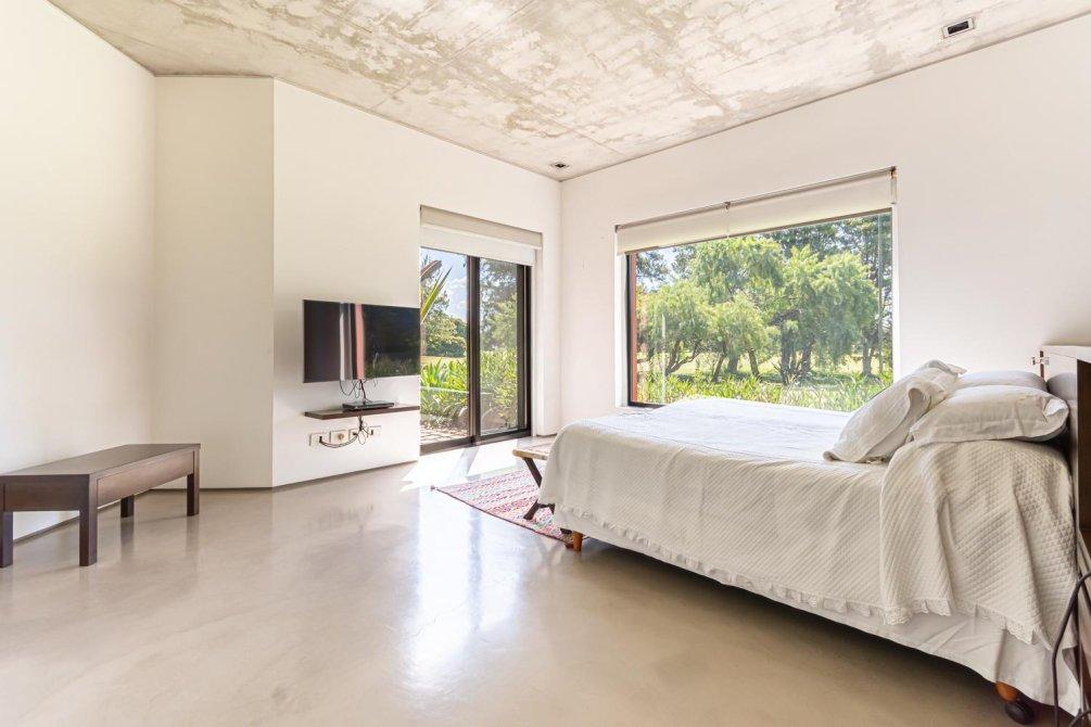 También en la planta baja, se encuentra un área tipo departamento que incluye: una master suite con un gran ventanal con cortinas automáticas y vista al campo de golf; el baño, revestido en mármol de Carrara, con ducha y bañera; un importante vestidor, un escritorio con kitchenette y sala de TV, conformando un espacio amplio y muy cómodo en la casa para disfrutarlo y/ó poder trabajar cómodamente en Planta Baja.