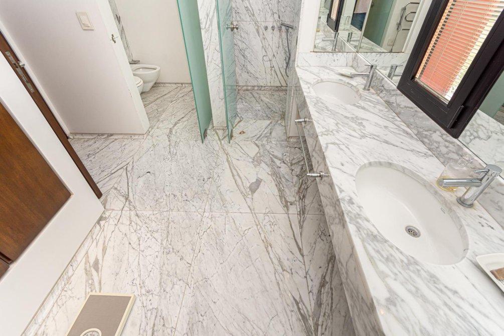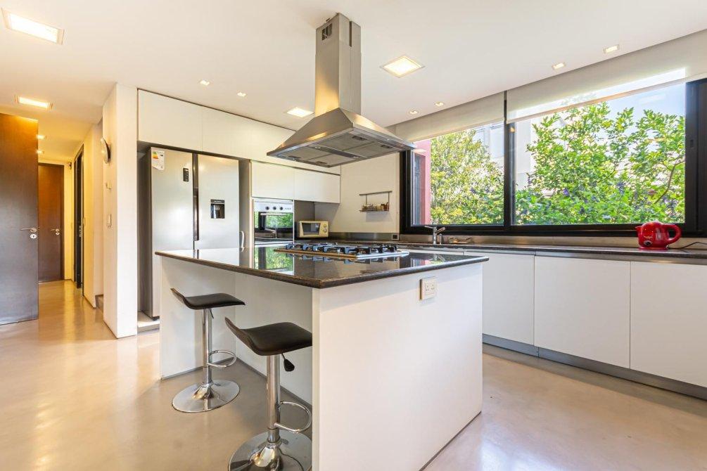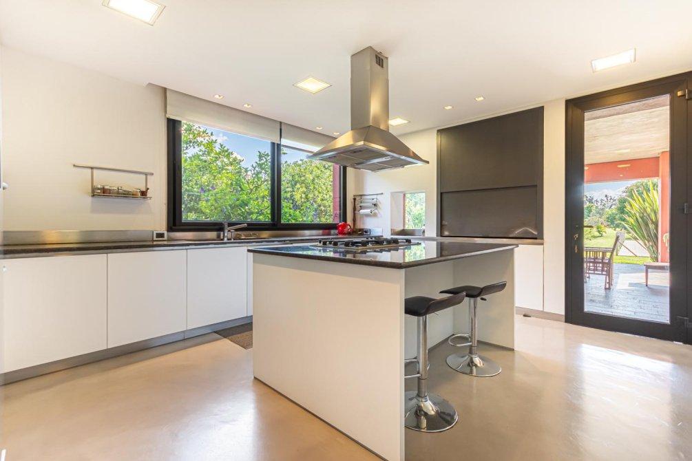 La cocina es amplia y muy luminosa. Con mesadas de mármol de granito marrón, isla con anafe incorporado y butacas con desayunador, tiene muchos detalles pensados para agregarle confort y funcionalidad. Desde la cocina se puede acceder también a la parrilla, permitiendo, si se prefiere, preparar un asado sin salir al exterior. Además, hay también una heladera bajo mesada de frío regulado, ideal para conservar la carne y las bebidas.