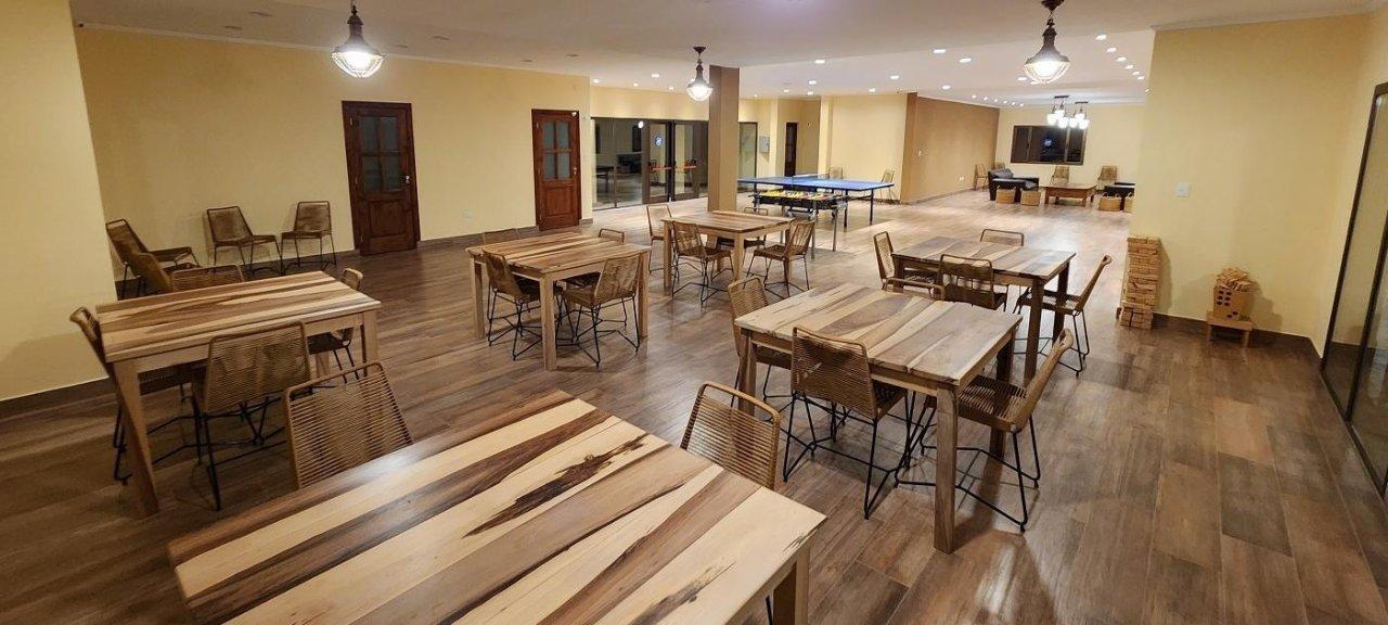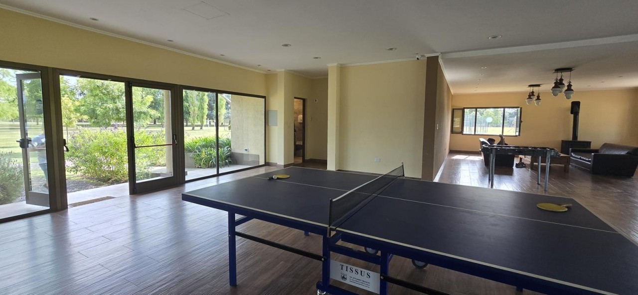 Posee un sum de usos múltiples, canchas de tenis, parrillas de uso común y juegos para niños.