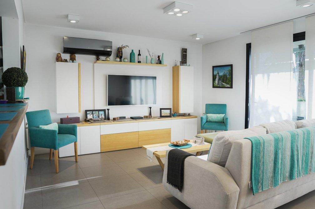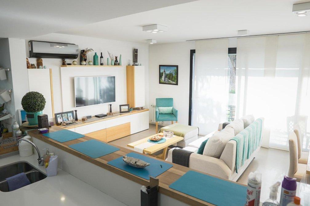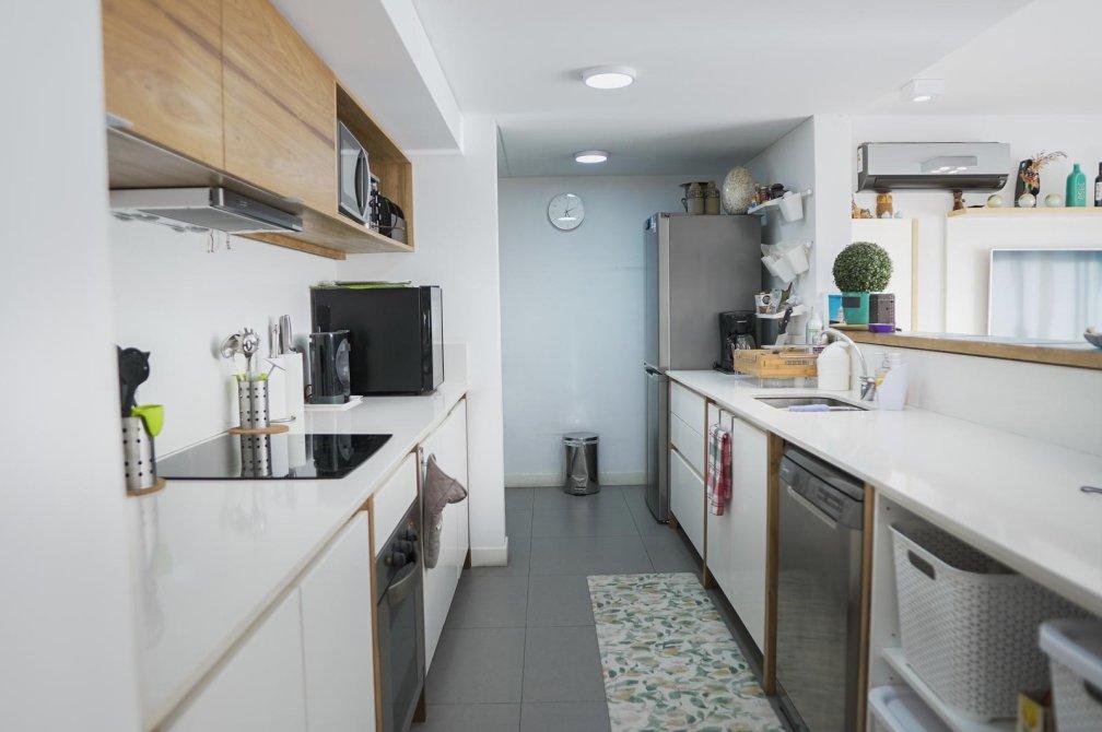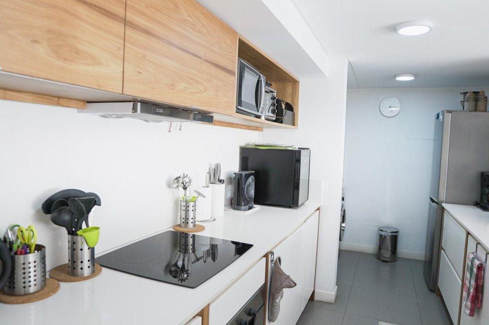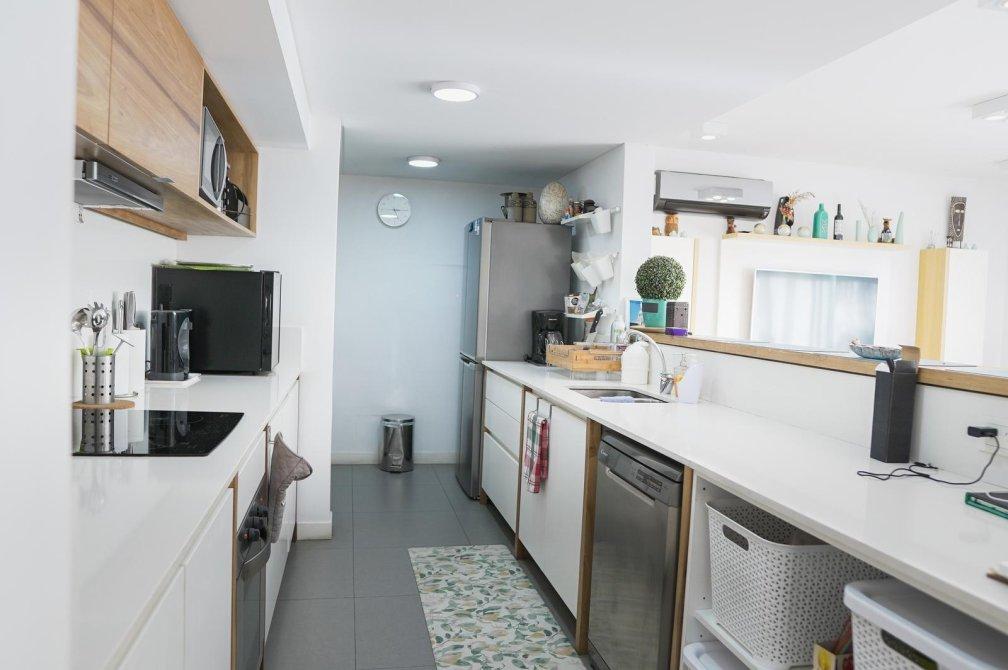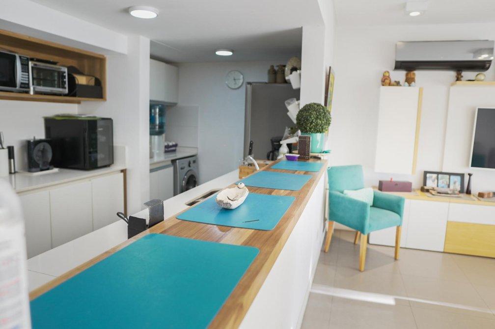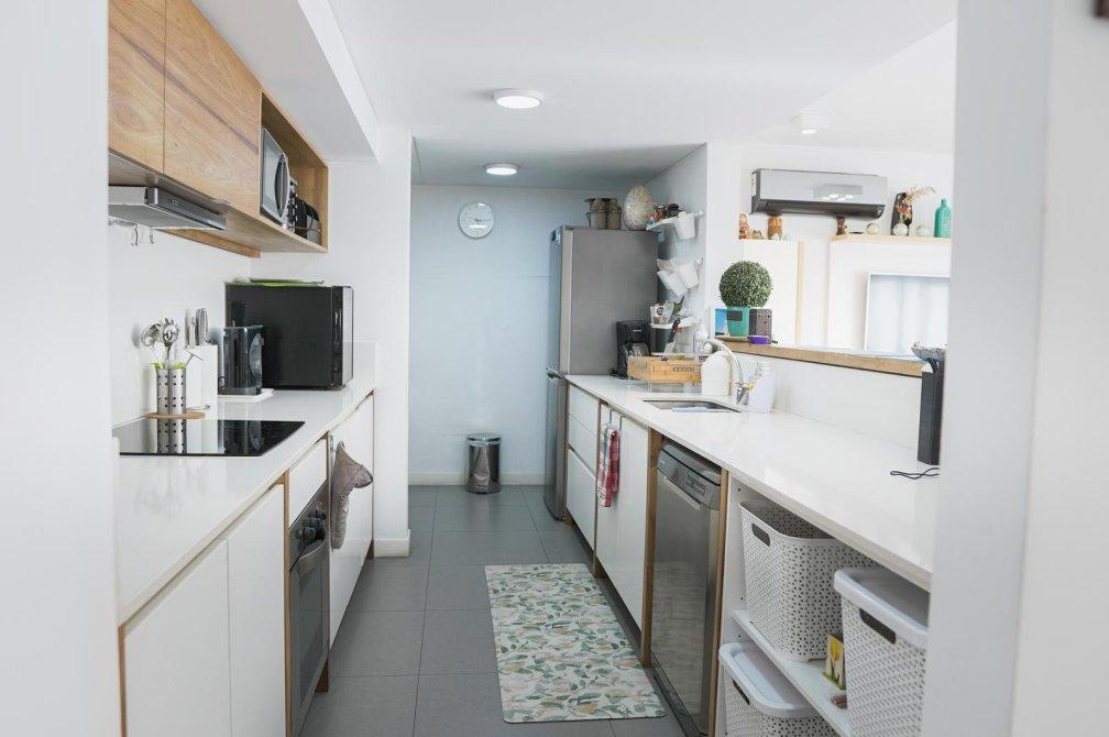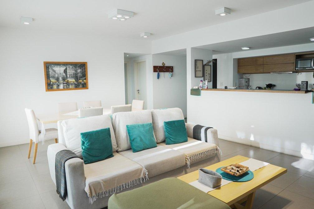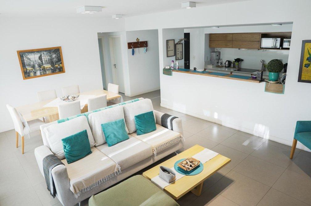 Al ingresar, serás recibido por un amplio living comedor con salida a un balcón corrido que ofrece una vista abierta a la piscina del edificio. La cocina, semi-integrada mediante una elegante barra desayunadora, está equipada con muebles de diseño en tonos madera, mesada de silestone blanco, anafe vitrocerámico, horno eléctrico y un práctico lavadero semi-integrado.