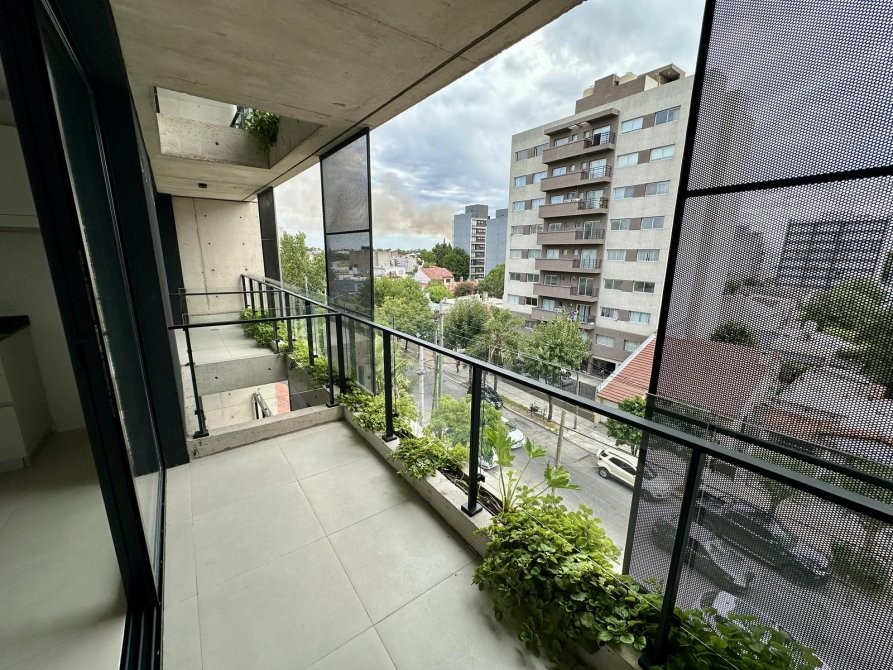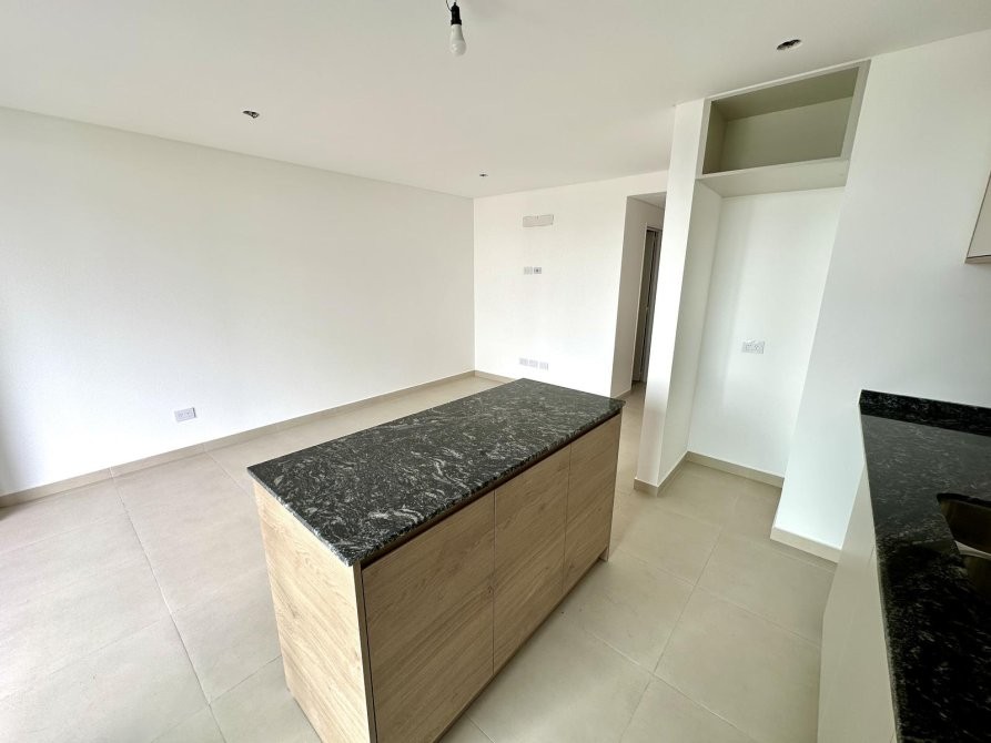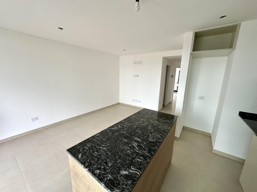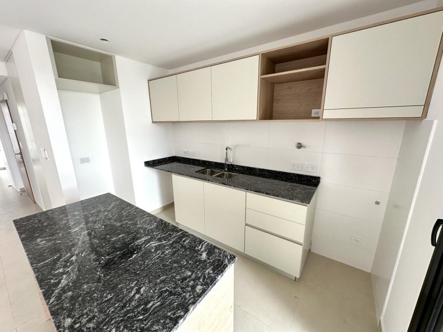 Al ingresar, se encuentra una amplia cocina-comedor equipada con muebles bajo mesada y alacena, mesada de granito gris mara, y grifería monocomando. Desde aquí, se accede a un balcón que ofrece espacio adicional al aire libre.