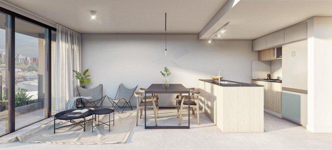 Se ingresa por cocina integrada al comedor con muebles bajo mesada y a alacena, mesada de granito gris mara (o similar) con bacha de acero inoxidable y grifería monocomando. Salida a balcón. Un dormitorio con placard integral tipo americano en melamina. Baño completo.
